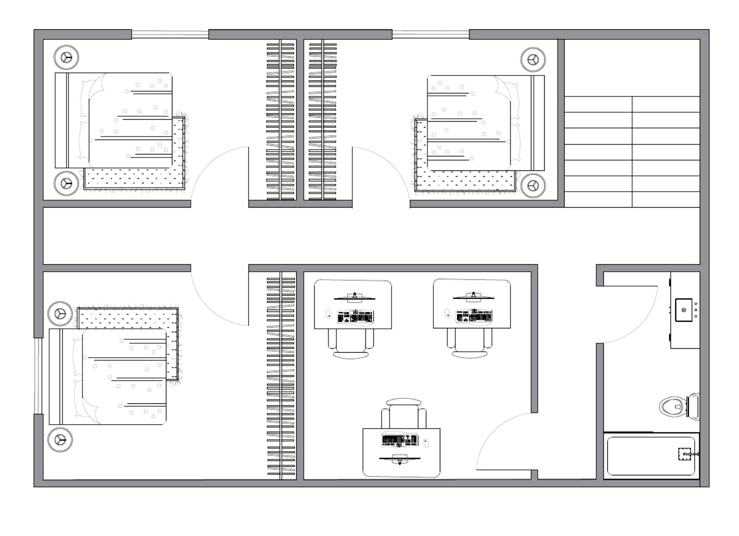 convert this floor plan into a realistic isometric 3d view of a full house show the space from an elevated angle with furniture walls and details visible modern upper level interior of a commercial live work space with a clean contemporary design the layout includes three bedrooms positioned along a hallway each bedroom styled with a different bedspread and subtle variations in d cor while maintaining a cohesive neutral palette the flooring throughout the level is dark plank wood creating contrast against light modern walls and trim a central hallway connects the bedrooms and features sleek recessed hallway lighting that softly illuminates the corridor an open staircase connects the levels and features a modern open stair design with minimalist posts and horizontal cable railing creating a light and airy architectural feature keep the layout the same add greenery outside make exterior black cedar use the same furniture as shows on the plan do not change the orientation of the floorplan