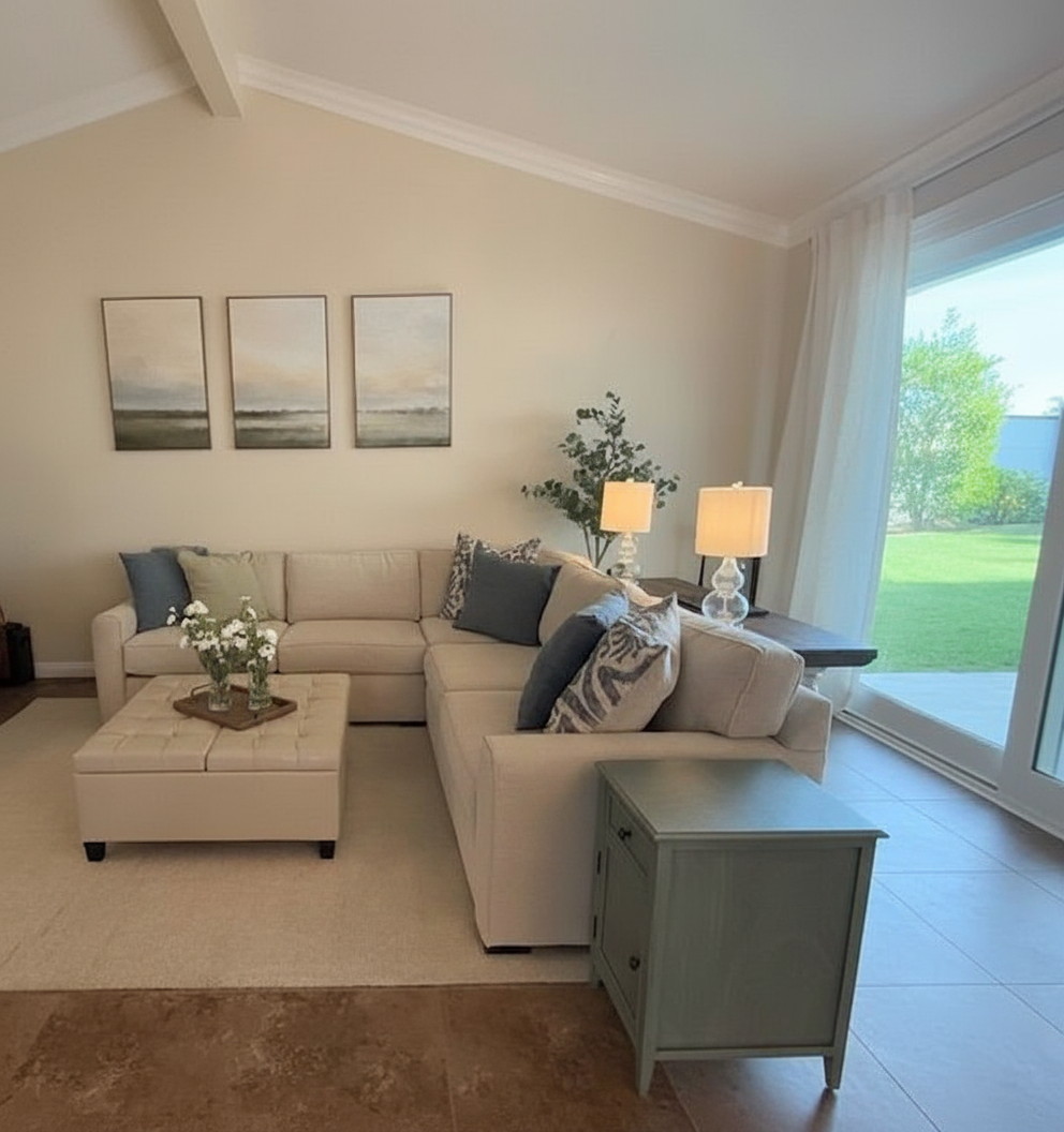 a minimalist hair salon station defined by clean geometry and a warm natural material palette a continuous wooden counter in dark oak finish spans the length of the wall creating a strong horizontal element below light toned drawer units with slim metal legs maintain a sense of lightness and functionality vertical suspended mirrors with elongated oval shapes are positioned rhythmically along the counter each mirror is framed with a thin matte black metal outline enhancing contrast and adding a subtle industrial touch integrated soft led lighting surrounds the mirrors producing a warm diffused glow the mirror surfaces are slightly blurred creating an abstract and artistic reflection rather than a sharp image this effect softens the visual experience and contributes to a calm relaxed atmosphere a central vertical wooden slatted panel adds texture and depth while large window openings allow natural light to flood the space reinforcing the feeling of freshness a touch of greenery completes the composition bringing balance and a natural serene character overall style minimal warm soft modern with subtle industrial accents glass behind the mirror show the view white and blur street view of neighbourhood