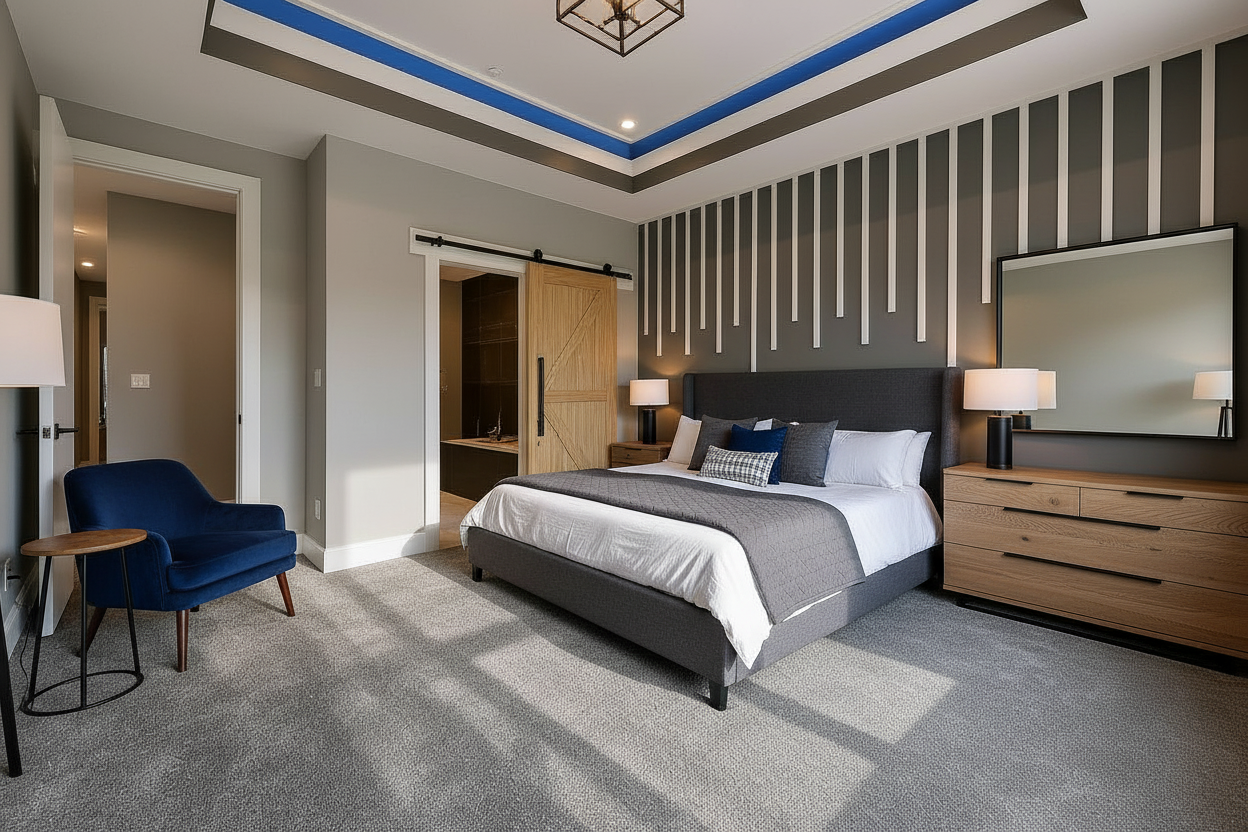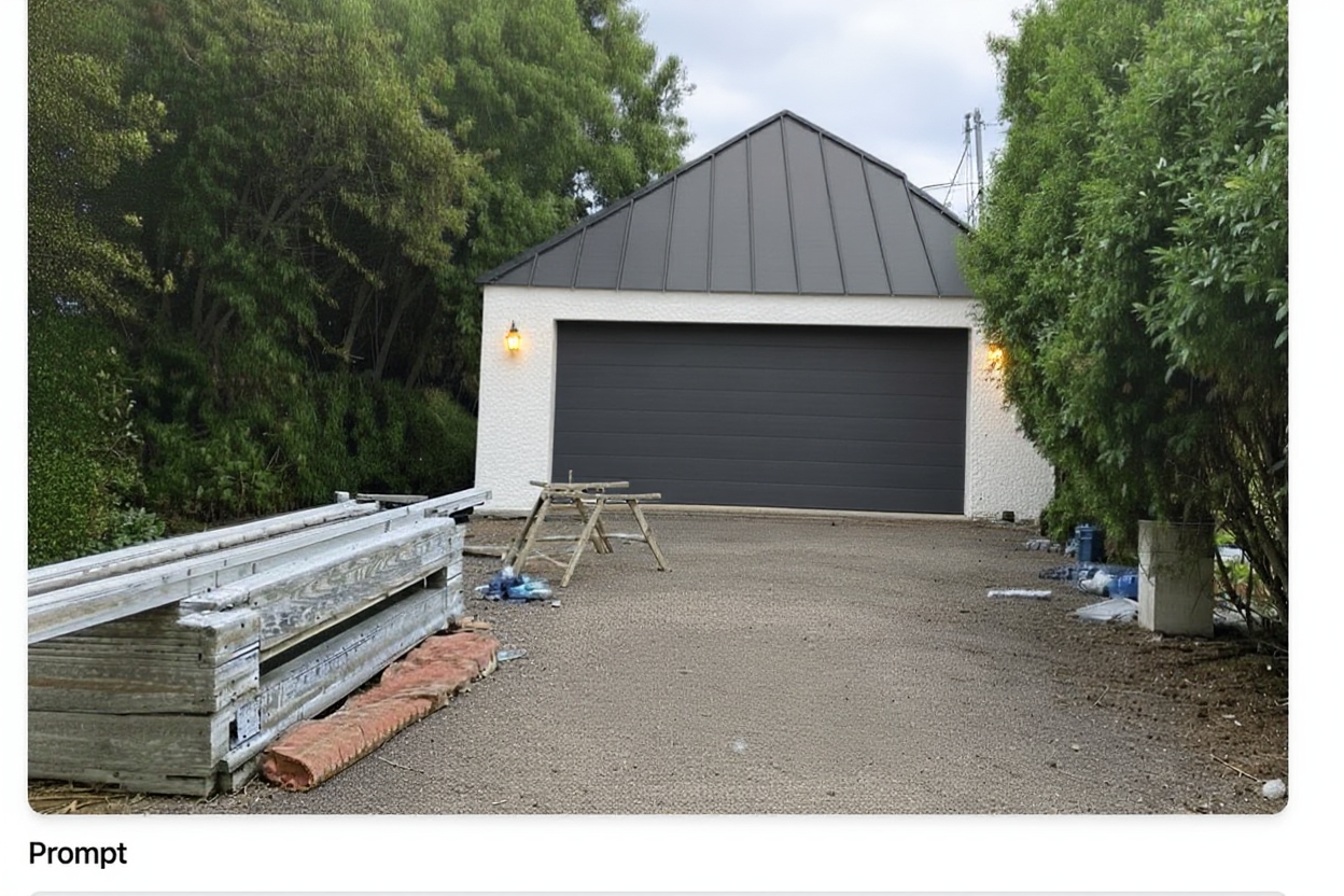 pale grey garage door colour horizontal door panels colorbond stell roof in dark grey large lantern wall lights wall finish is vertical wood wall panels in white large pebble stone driveway remove all other elements on driveway