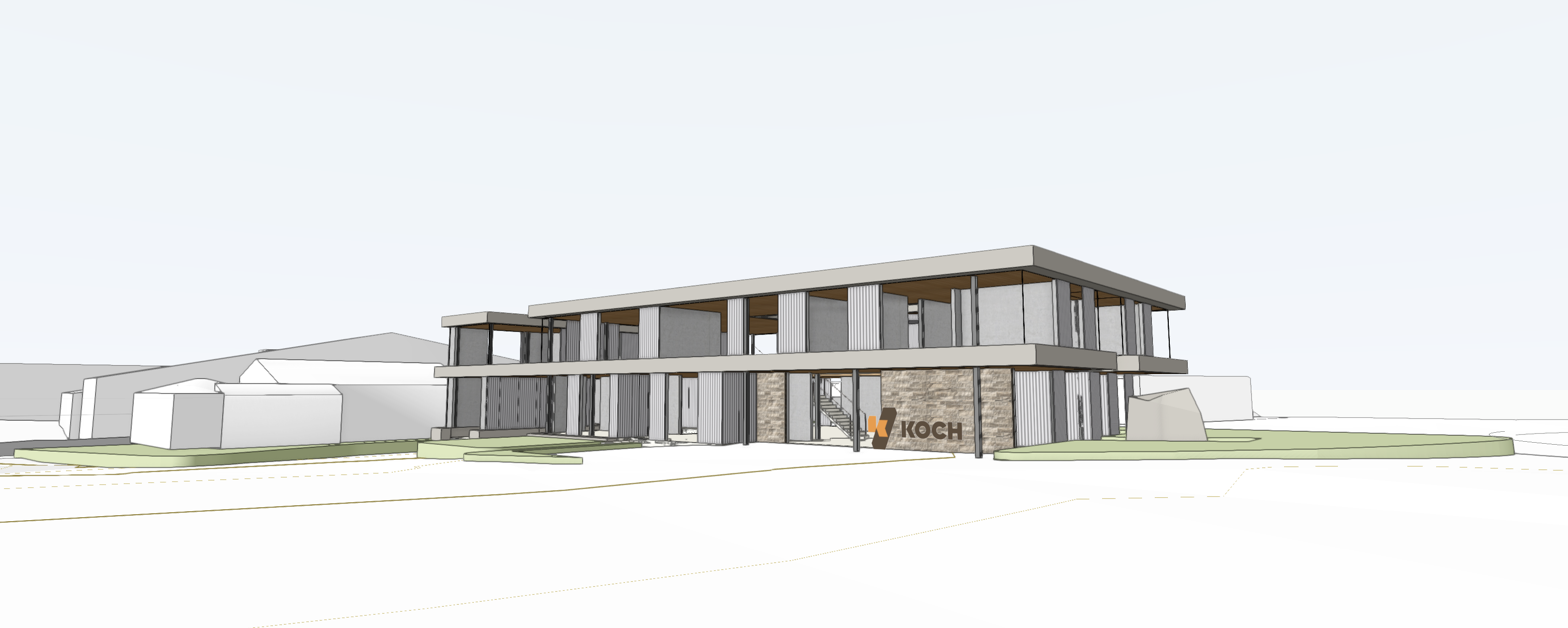 render a modern architectural office building with two stories featuring a sleek design use sheet metal gray for the fa ade with accents of stone texture in warm beige the windows are large with a reflective glass finish framed by dark steel the roof is flat and the overall structure is minimalist surround the building with a lush green lawn and subtle landscaping include a clear blue sky with soft clouds to create a serene and inviting atmosphere