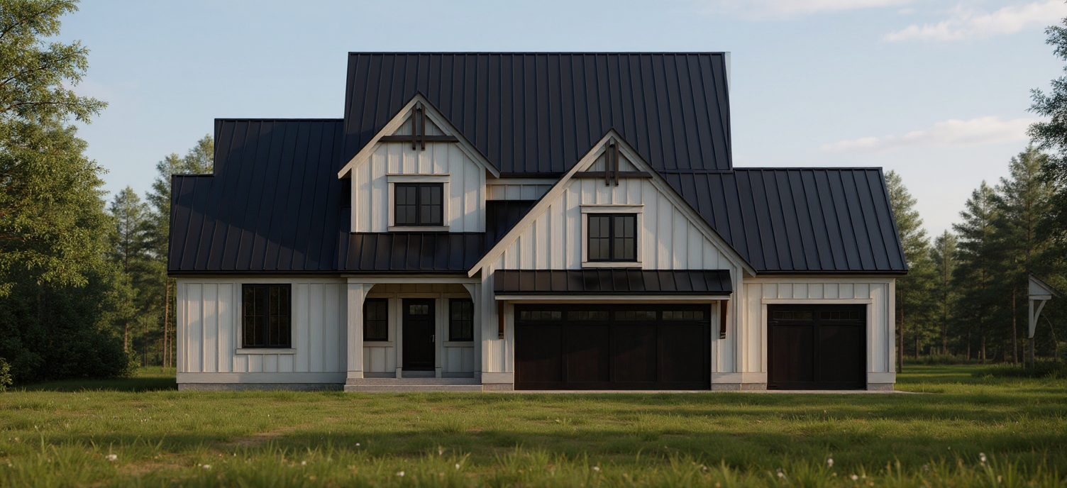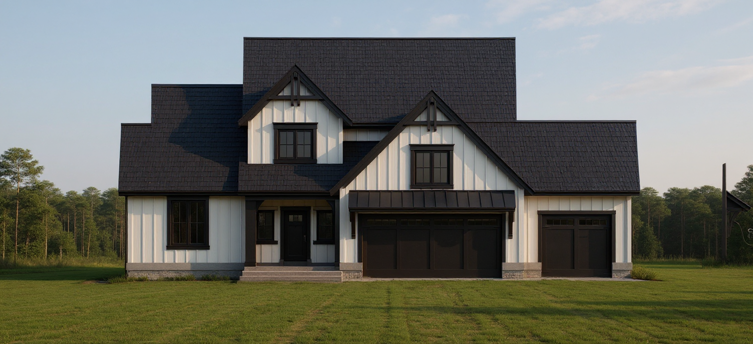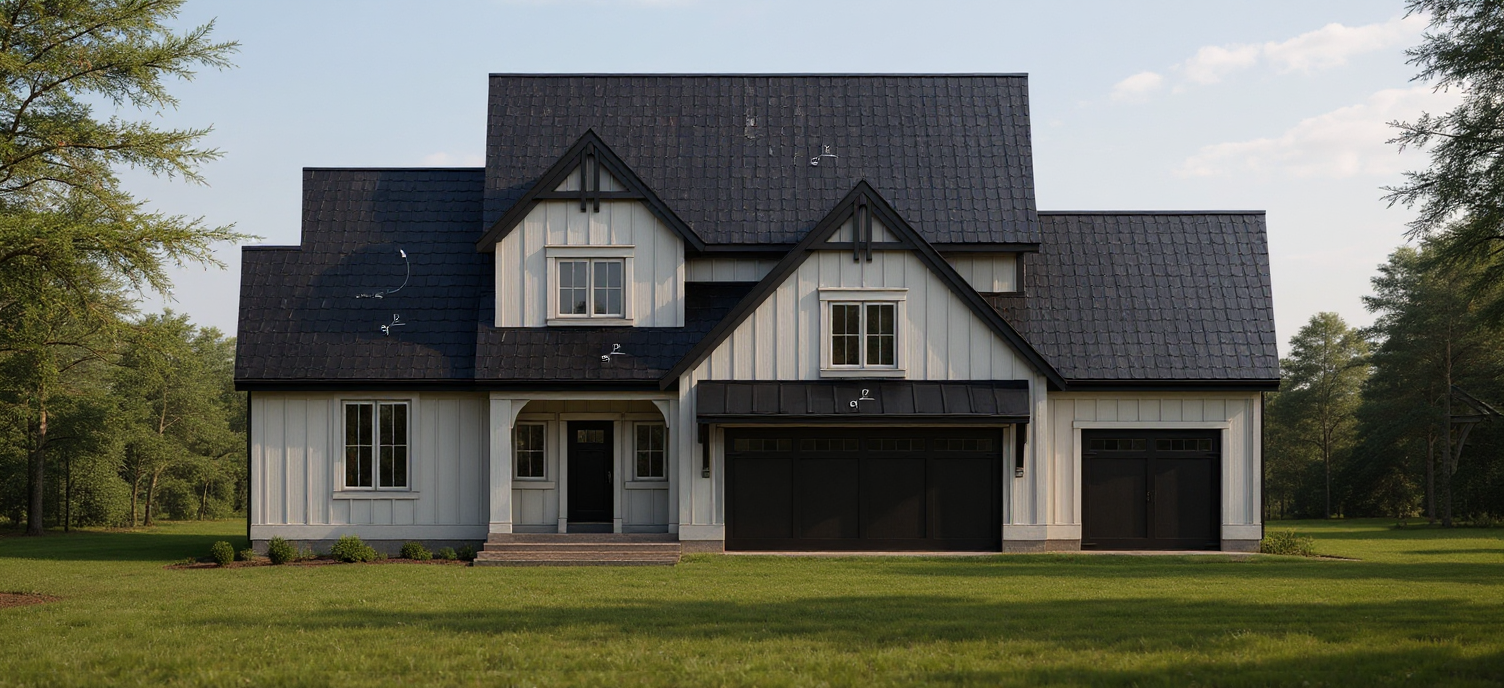 make the roof black make the house modern white and black remove words and arrows make roof a shingle roof make the siding board and batten