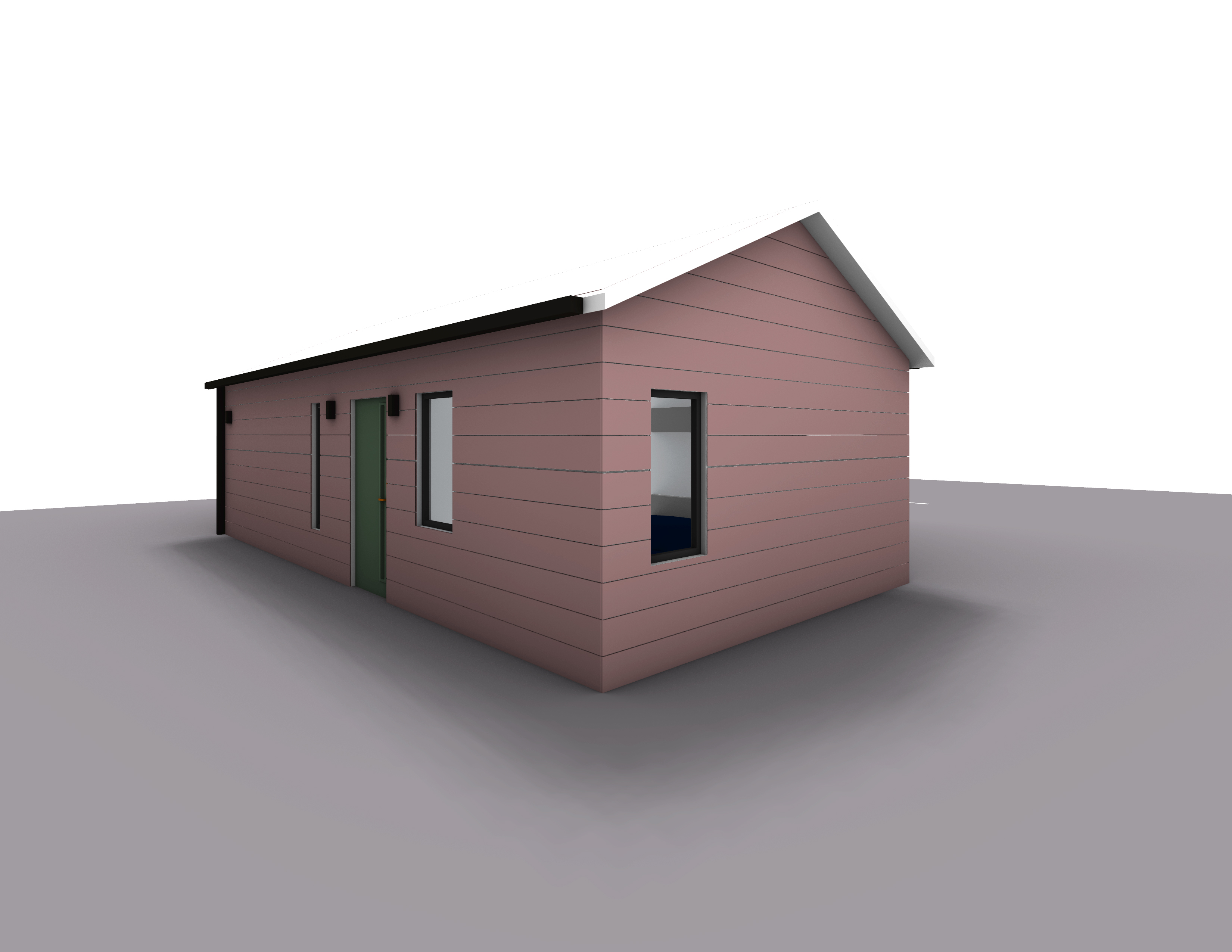 realistic render of adu exterior siding ia a desert mauve with charchaol grey trim under eaves is recessed lighting the environment is residential neighborhood of loma linda it s midday keep door the same color as image all trim is charcoal grey roof is sandy