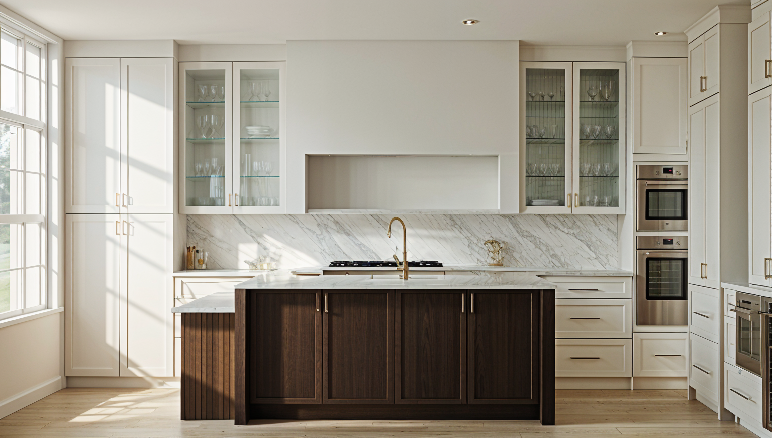 create a high end photorealistic render of a bright luxurious bedroom with a refined and expensive feel the materials should feel authentic with realistic texture the flooring is matte with a polished cement look in a sand off white shade cohesive and elegant the lighting should be warm natural and balanced maintaining a bright atmosphere while preserving soft shadows and depth dd beautifully arranged high quality bed linens with soft folds and a premium hotel aesthetic the overall mood should feel contemporary sophisticated bright and editorial as if photographed for a luxury interior design magazine pendant lights beside the bed has fabric like surface has fine pleats forming two overlapping layers that create a dynamic textured look travertino behind the bed until the wood stripe
