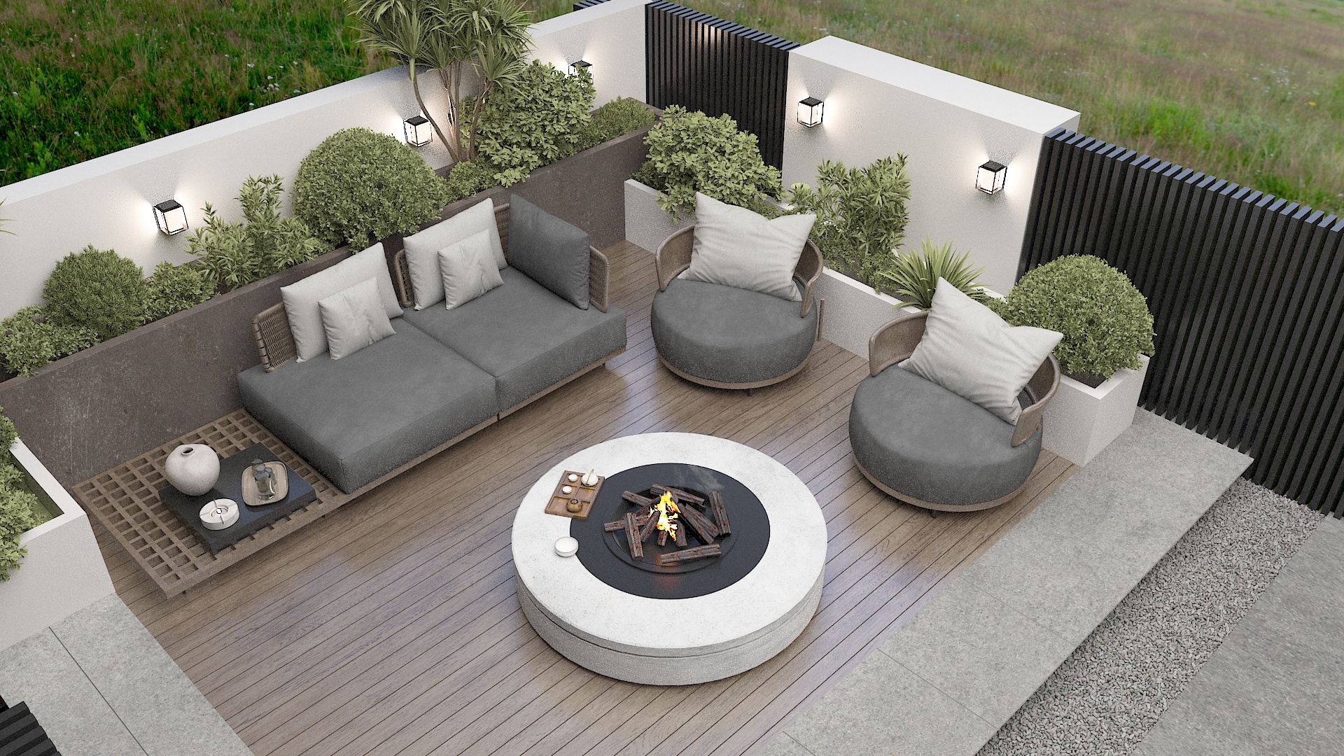 create a hyper realistic outdoor space bathed in midday sun with soft shadows and realistic glare realistic plants in concrete white and brown planters fence made of white concrete and black aluminum bars realistic sophisticated and elegant details do not change anything in the picture and do not add anything