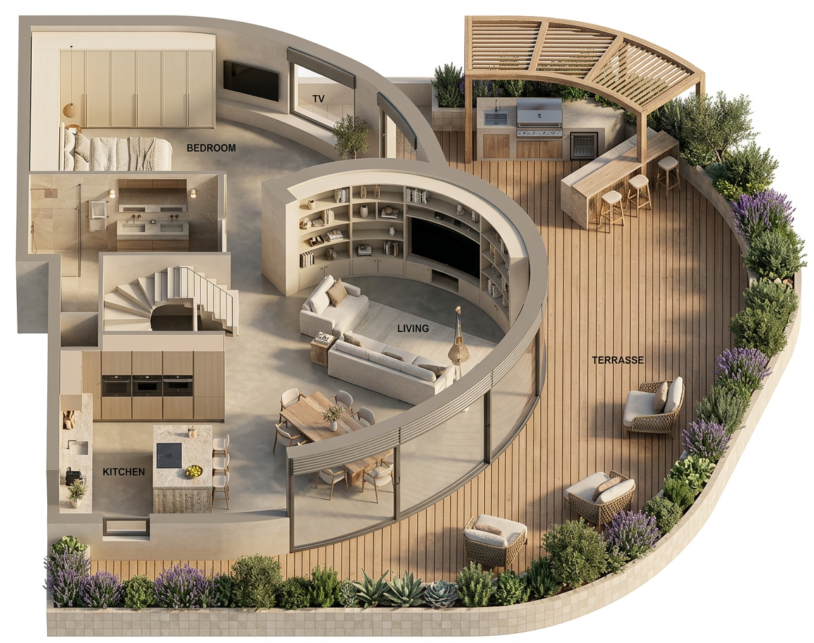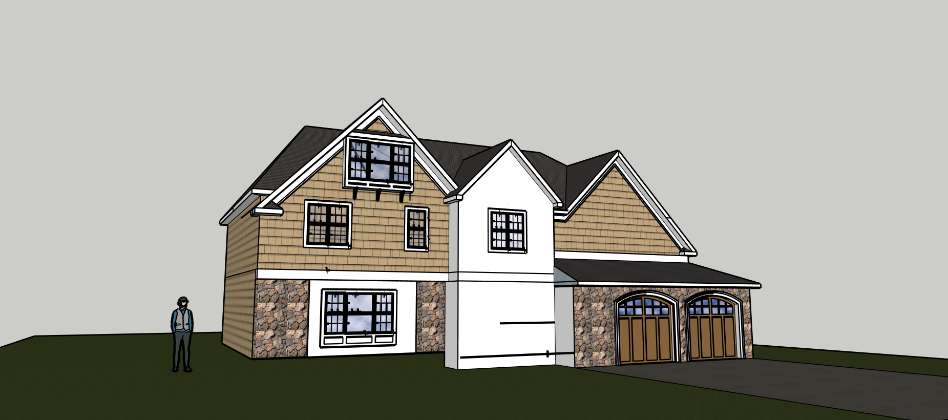 realistic rendering with trees behind the house sunny day with clouds and a car inn the driveway