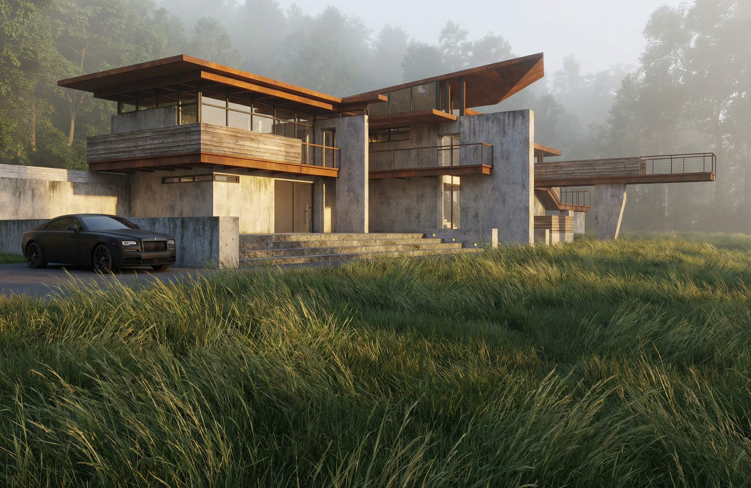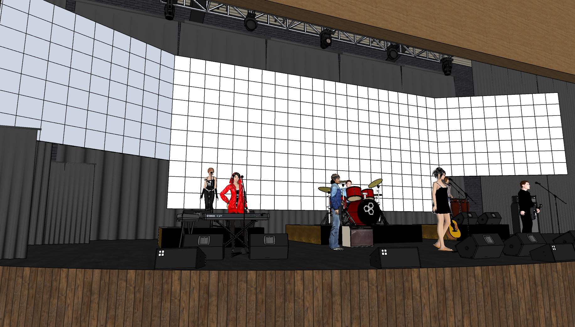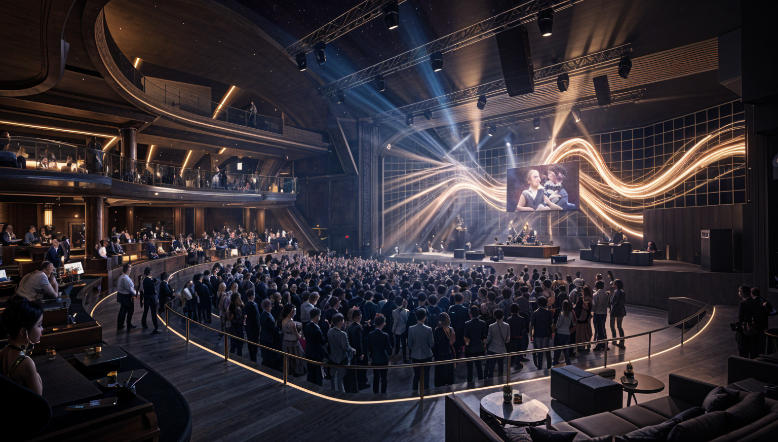 bobby mcalpine perspective shot designed by zaha hadid interior shot perspecctive is from the from row stage right use an excited full audience new urbanism perspective shot keep the exact camera angle distance and perspective from the supplied image do not move the camera or change focal length convert this scene into a photoreal upscale nightclub at night preserve the architecture exposed steel trusses balcony railings ceiling height stage shape wood fascia rigging positions and the single led wall do not change the geometry the audience area in front of the stage is a sunken dance floor that sits lower than the surrounding level the perimeter walkways and lounge platforms around it are higher preserve this elevation change do not flatten the floor levels add dramatic stage lighting with visible beams and subtle haze originating from the existing fixtures on the truss the single led wall should be slightly dimmer than the stage lighting display one unified abstract motion background clean and consistent no collage no text no logos no photos add a rectangular picture in picture imag overlay inside the led wall content as if routed through a switcher the led wall is the only screen do not add any other displays add upscale lounge seating with premium materials like leather velvet brushed metal and dark wood around the higher perimeter areas increase patron density patrons should face the stage and pay attention to the performers use polished concrete flooring with soft reflections lighting is warm and architectural mood is modern exclusive energetic concert ready architecture architecture architecture