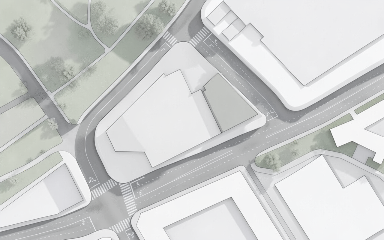 exterior shot digitally rendered architectural illustration presentation drawing extremely restrained and delicate whites soft grays near monochromatic with green as the only real accent characteristic of scandinavian or german architectural practice prioritizes legibility and elegance over realism no shadows no trees