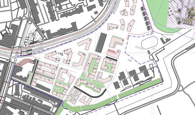 create a detailed urban masterplan for the given site boundary design a coherent and functional layout of roads pedestrian paths bicycle routes parking areas and green spaces within the area the road network should be hierarchical main access roads local streets service roads with safe and legible pedestrian and cycling connections parking areas should be integrated into the urban fabric partially hidden by greenery avoiding large asphalt surfaces plan a well balanced green system including public parks pocket parks tree lined streets green buffers and semi natural areas green spaces should improve walkability microclimate and social interaction and connect key parts of the site the composition should follow human scale urban design principles with clear spatial structure readable public spaces and smooth transitions between built and open areas style urban design competition board clean legible top down or axonometric view high resolution professional architectural visualization muted natural colors clear linework soft shadows
