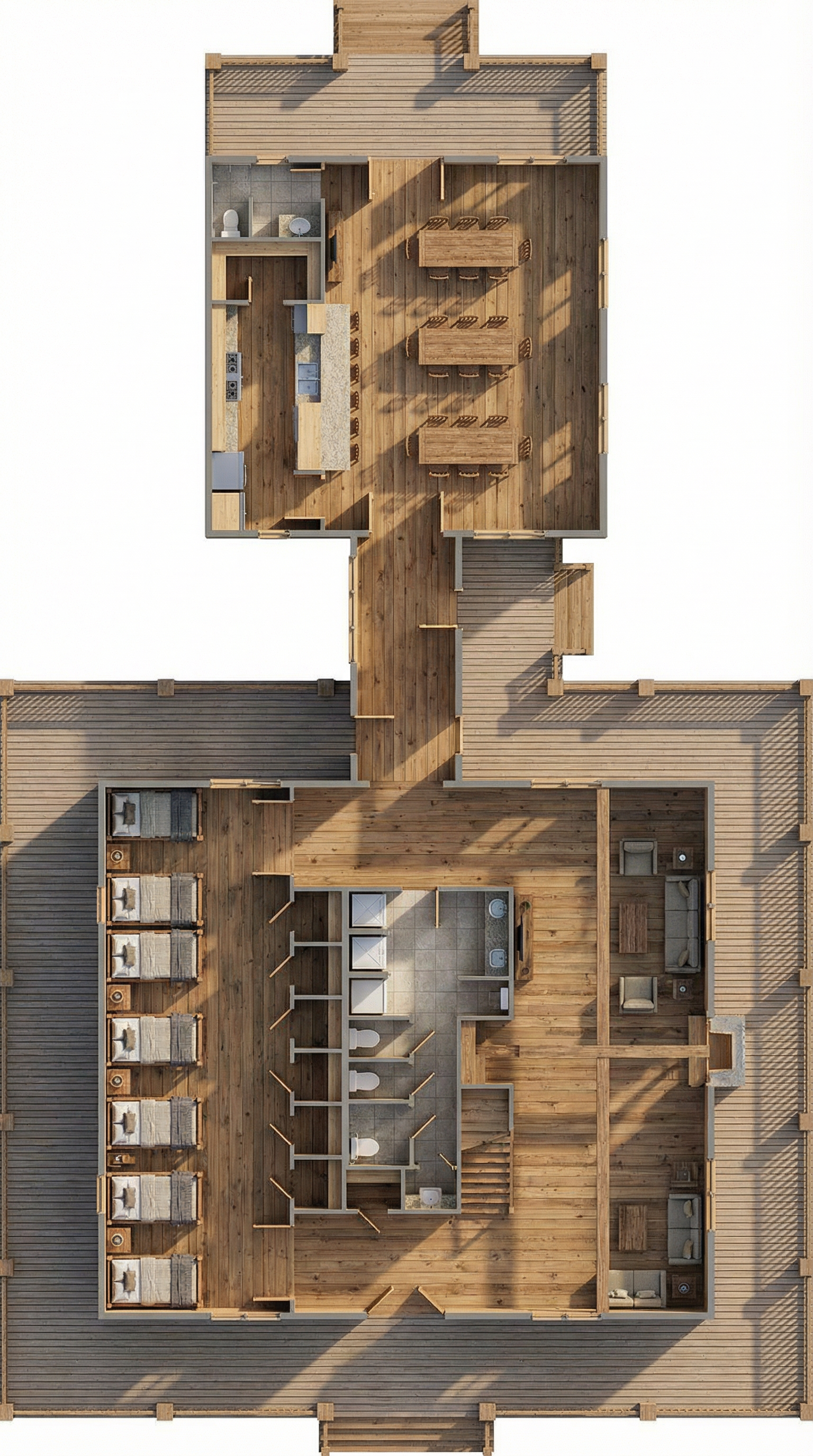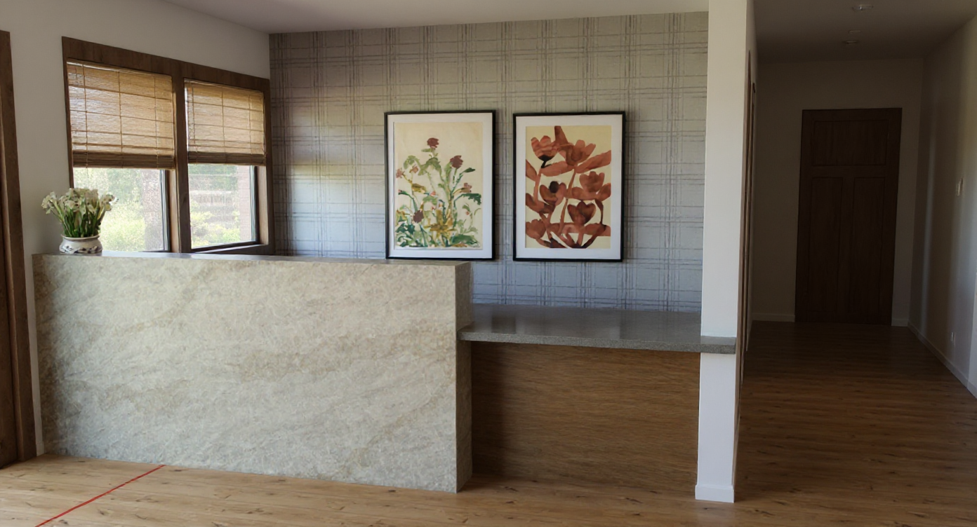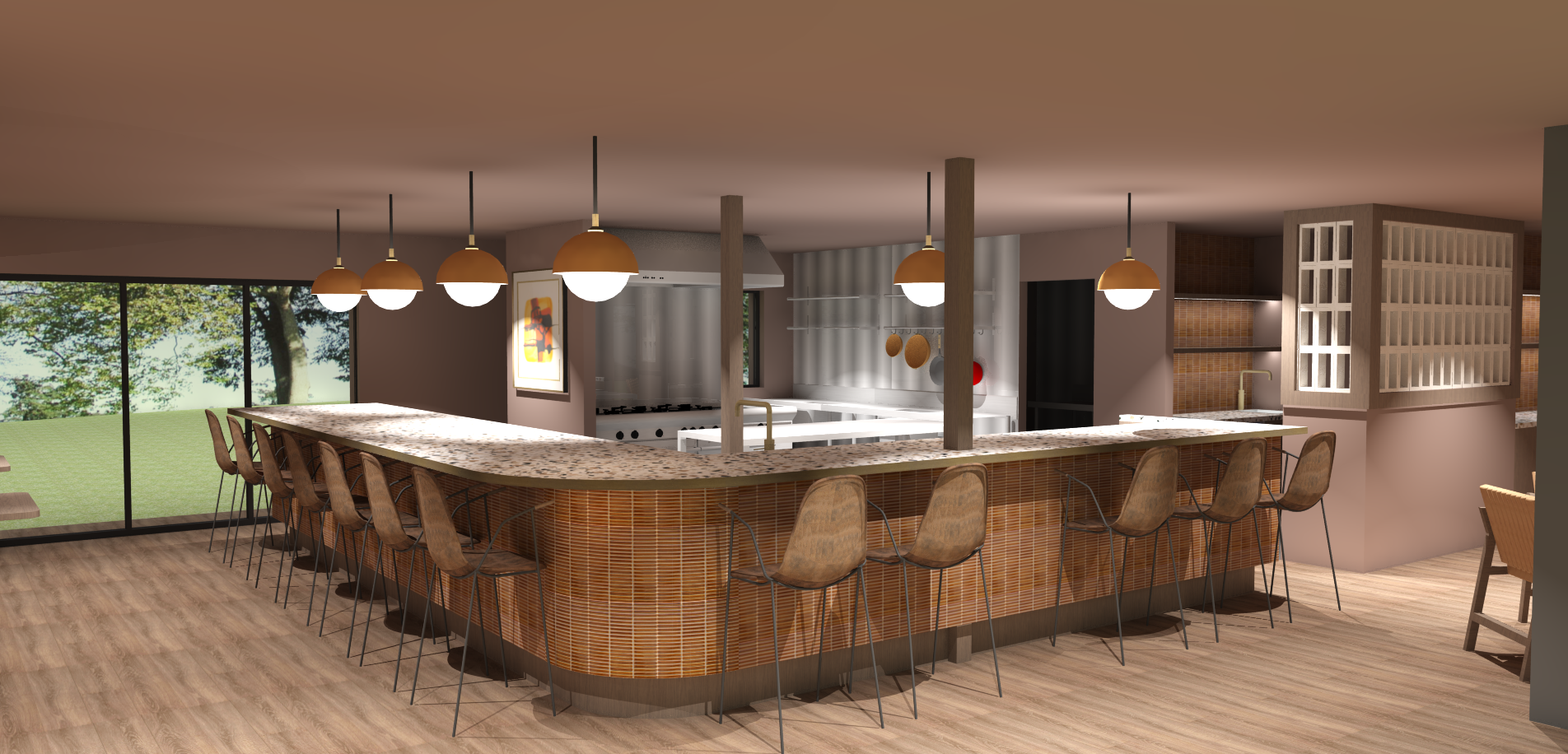 create realistic image front of bar to be tiled with the attached image walls and ceilings except the stainless steel walls in the kitchen in dulux picador colour