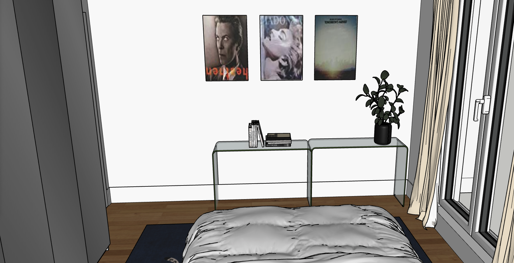 rug is blue closet has mirror doors bedside tables are in plexiglas