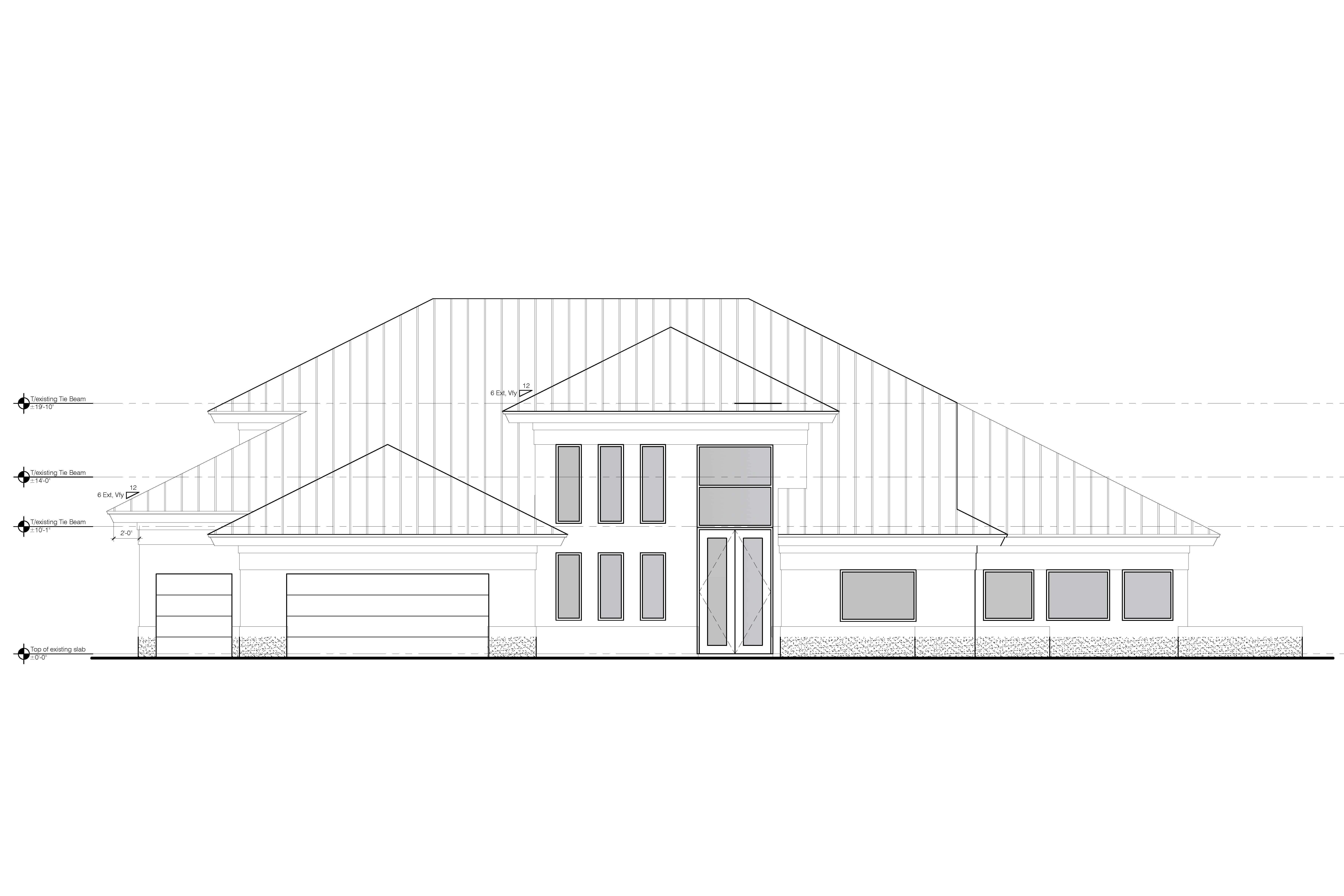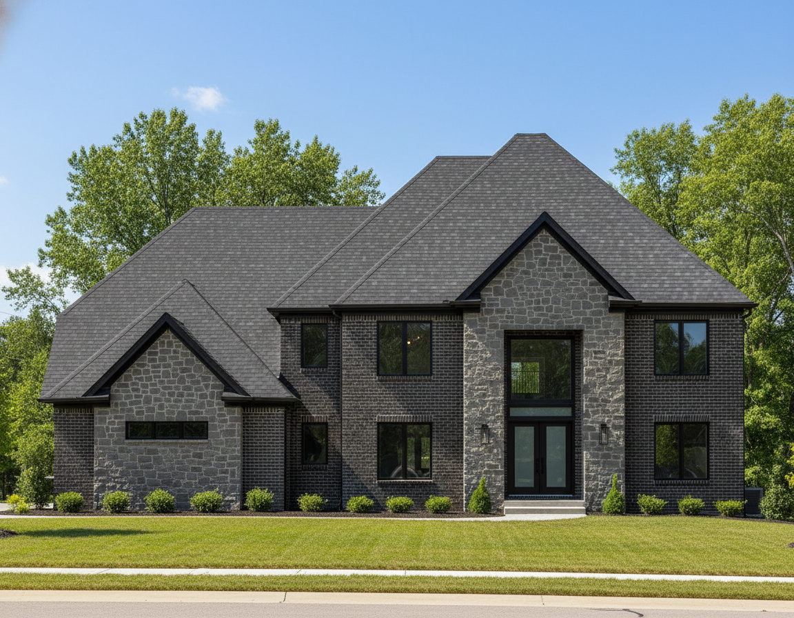 exterior shot front view of a transitional one story house with dark metal roof white painted walls black frame windows and doors suburban landscape blue sky sunny day