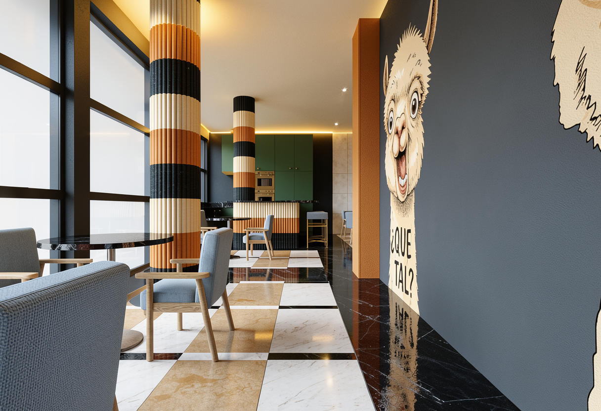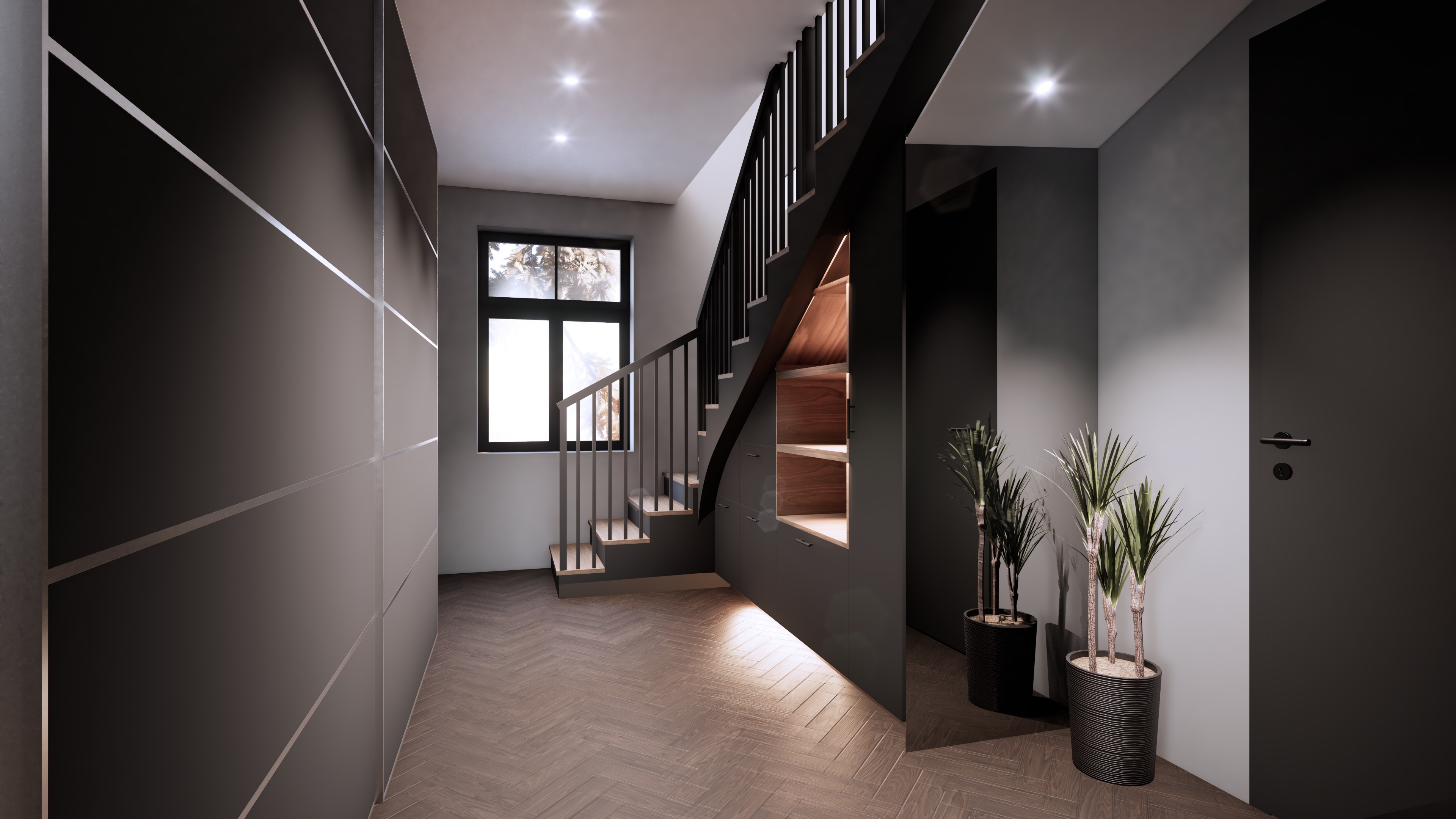 hallway in dark tones modern style accessories on shelves baseboards dark gray roman shade place a suitable one color light gray rug on the floor closer to the window and the stairs on the right side next to the door on the white wall add black and white pictures make the stair handrails and stair railings wood toned to create a softer overall look make sure there is an opening in the ceiling above the staircase leading to the second floor as there is no ceiling above the stairs so access to the second floor remains open make it photorealistic the reflection of the pictures in the mirror must be realistic