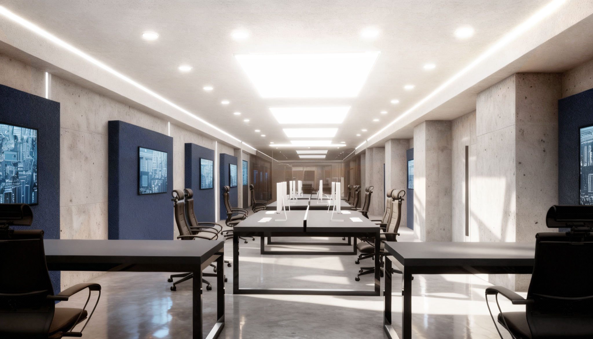 change the desk to wood and change the photos on tv to a navy militaire subject make the wall light gray and keep the blue panels change the picture of the computer to militaire subject make the ceiling white keep the vertical linear elements that glows light