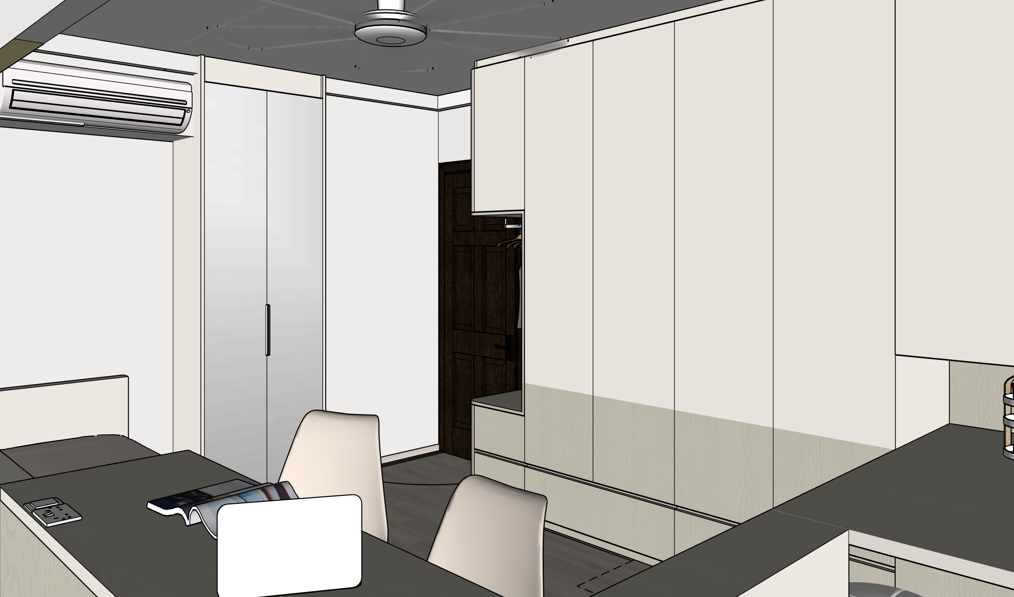 colours to remain accurate as per original given picture drawers and all table top surface in muted light warm earthy light brown solid laminate with subtle light olive undertone matte finish niche in light beige microcement and only bottom till study table in muted light warm earthy light brown solid laminate with subtle light olive undertone matte finish top half of carpentry in solid colour light beige and only bottom till study table in muted light warm earthy light brown solid laminate with subtle light olive undertone matte finish 2 doors full height cabinet in mirror recessed 150mm height skirting ontop ceiling in off white bed headboard in solid colour light beige floor in muted light beige vinyl subtle grains ceiling fan in white walls in off white sunlight coming in from the right side of room edge of wardrobe to be curved