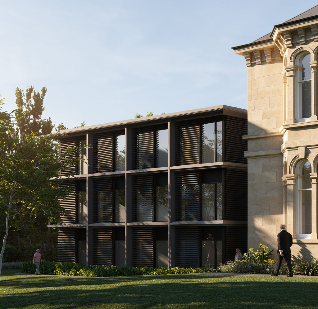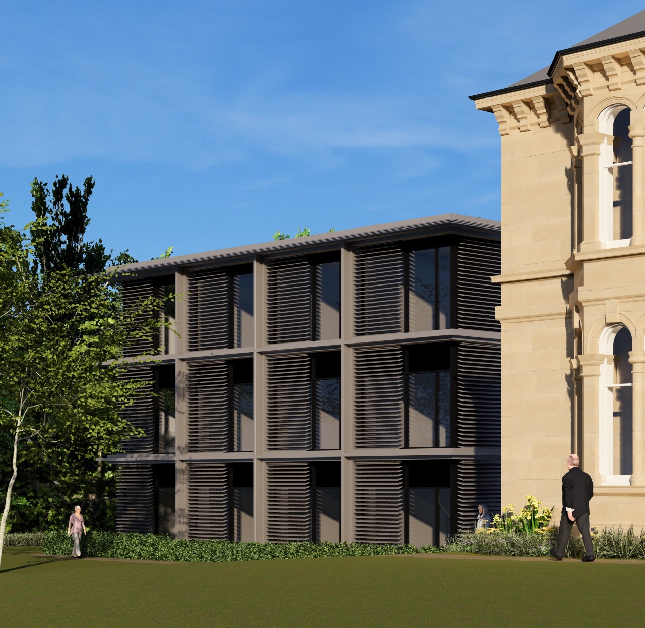 keep shadows as in original image add realism modern building is set quite further back than it looks lighting should reflect this