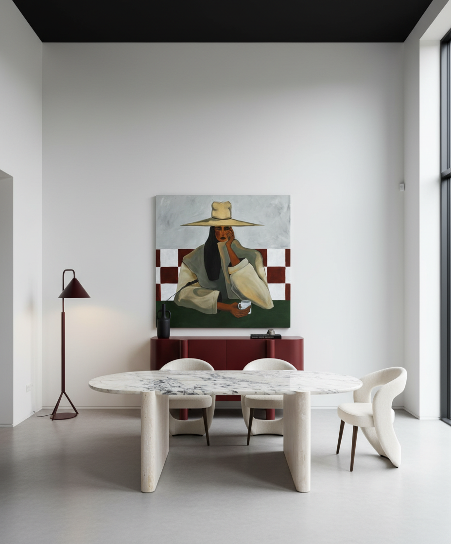 room floor is concrete walls are white ceiling is double height and black the art work is big above the sofa lighting is track light add a rug that matches the art work