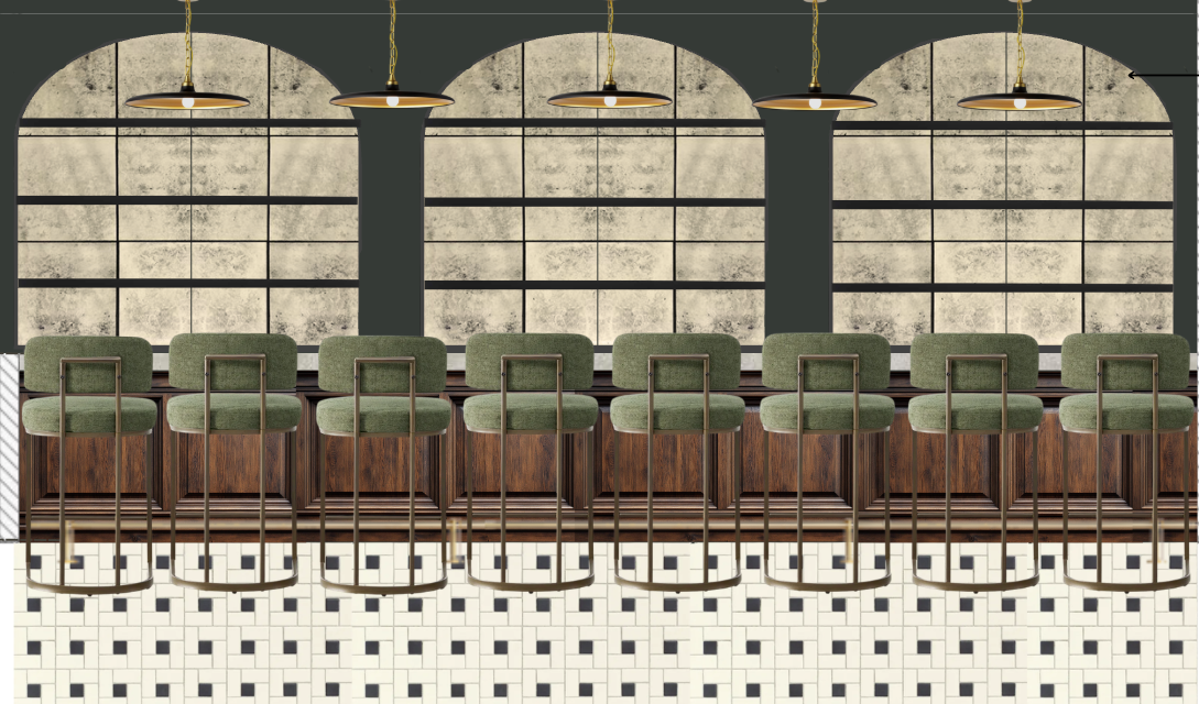 render image realistically in 3d the checkered floor to have depth and perspective make it appear in a real room the stools face towards the bar there are led lights under the arches for the mirrors in the bar fill out the bar shelves full of liquor