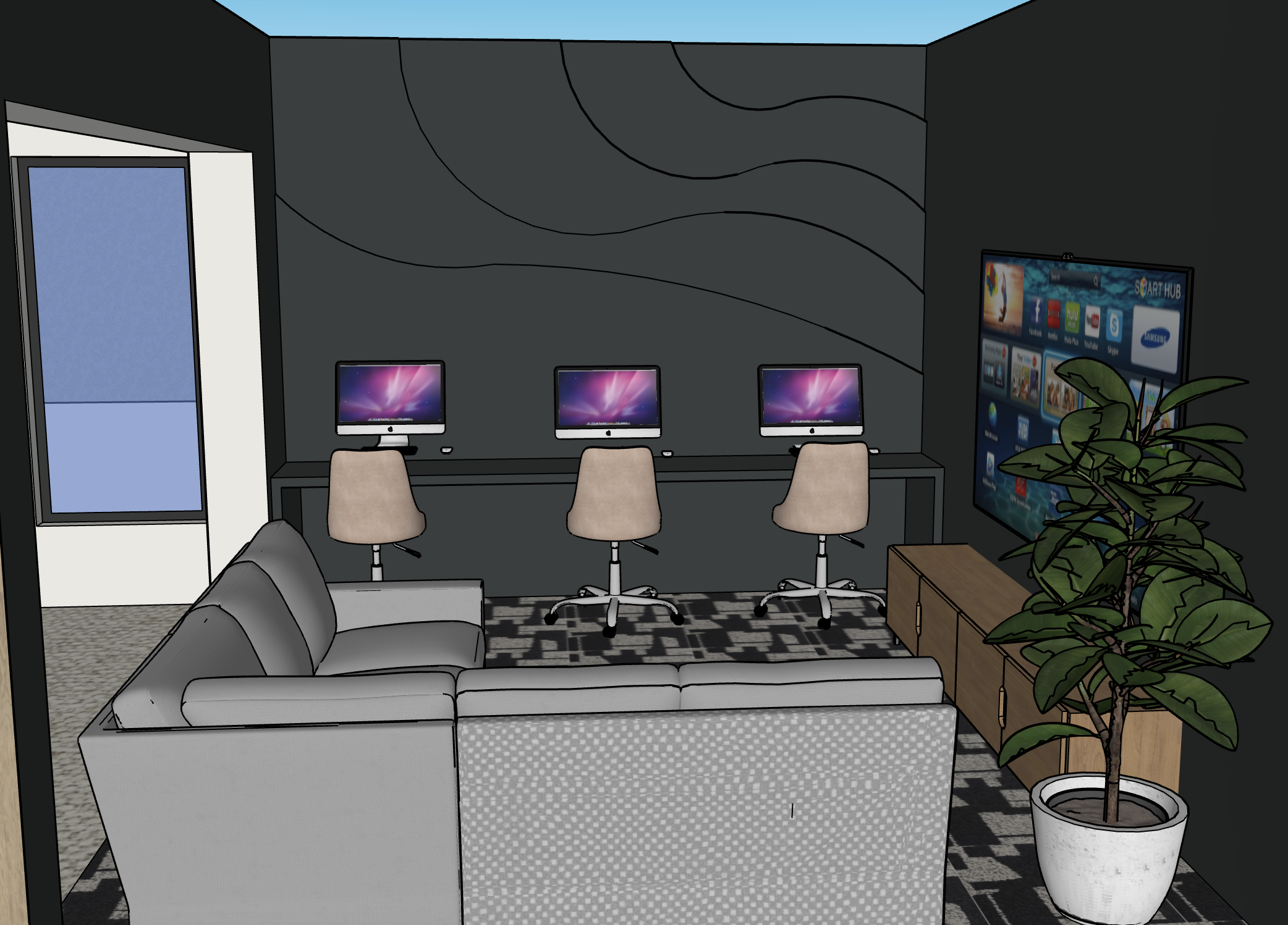 add different color neon lights above each wave on the back wall