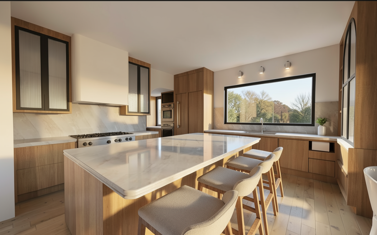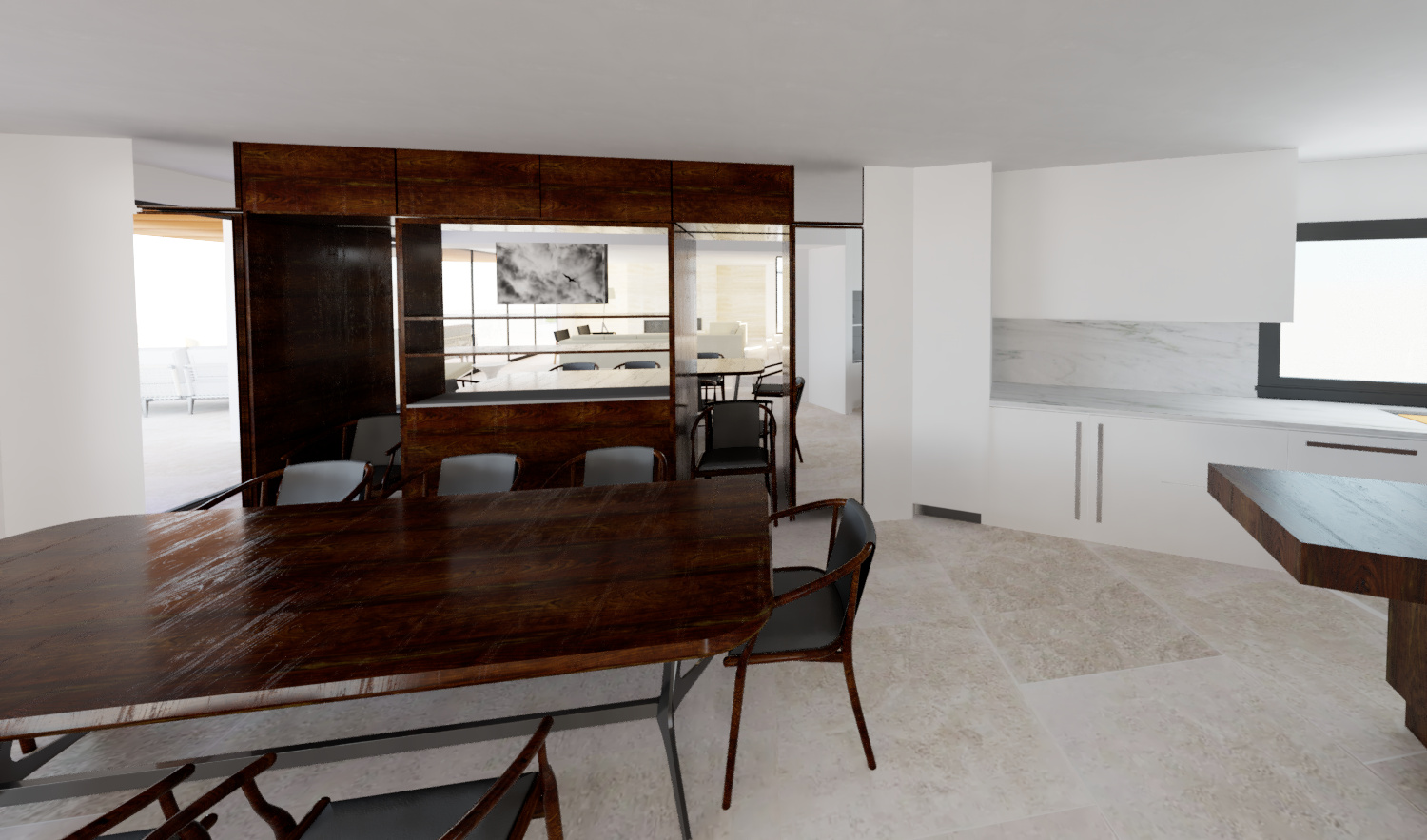 create a modern dining room and kitchen room featuring a spacious walnut table surrounded by elegant walnut chairs with black leather cushions the atmosphere is warm and inviting enhanced by rich walnut and glass cabinetry incorporate white walls and a light marble backsplash in the kitchen the kitchen cabinets are an ivory finish and color add a large window with black frames to allow natural light to flood in creating a bright airy feel the floor is light stone tile complementing the neutral palette