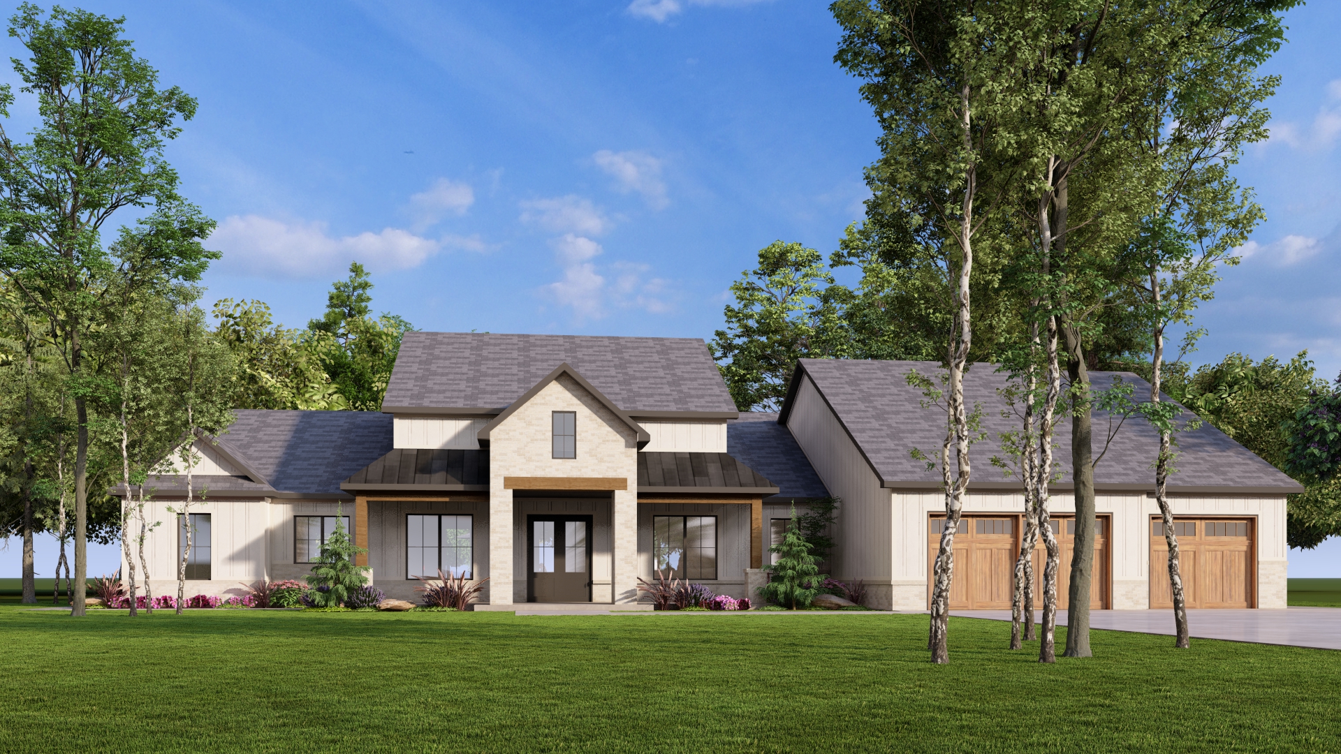 barndominium exterior shot use the same colors and materials as the photo but make photo realistic architecture