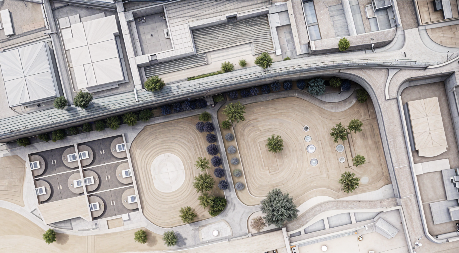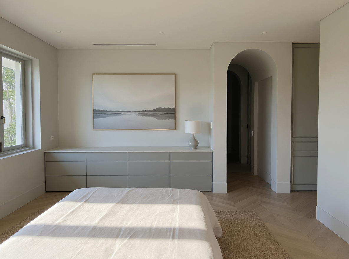 retain all architectural elements and arrangement including the cabinetry remove clutter from cabinetry bench and have a liaigre brizan table lamp on bench towards the left end include a large calm grey toned artwork in horizontal format above the bench add bed with it s head against the left wall only the edge of it will be visible in the foreground with most of the bed out of frame as the camera is looking over it bed to have austere luxurious oatmeal linen bed sheets that are oversized so they drape to the floor include a natural sisal area rug centred under bed
