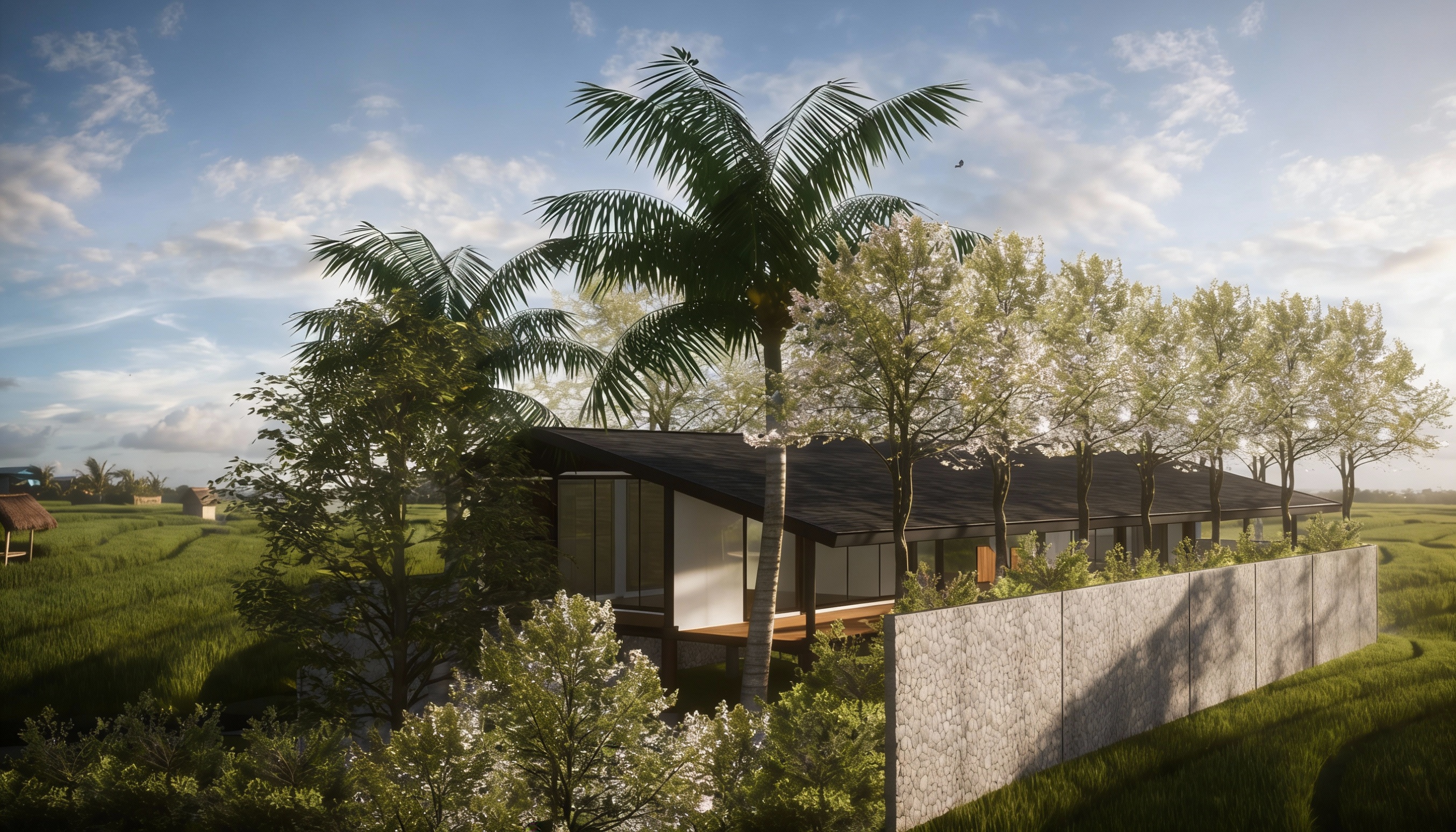 enhance the photorealistic look and blend the elements into noon ambience maintain the original elements make the trees more varied and natural with group of trees and variation of heigh