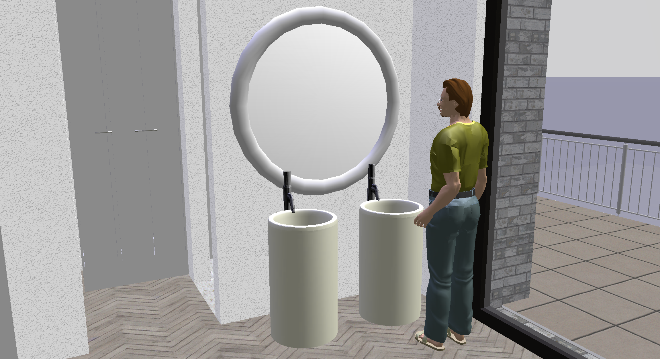 genau dieses rendering berarbeiten fotorealistisches innenraum foto exakt dieselbe perspektive und kameraposition wie das hochgeladene referenzbild 100 identische raumgeometrie exakt gleiche m belanordnung exakt gleiche verlegeart und richtung von parket wie vorlage exakt identische fensterpositionen mit gleichem ausblick durch die fenster weiches nat rliches tageslicht leicht schr g einfallende sonne durch die grossen fenster geschlossene r ume k nstlich ausleuchten sanfte realistische schatten blickrichtung ist nach osten sonnenlicht kommt von s den realistische materialien echte holztexturen stoff mit leichten gebrauchsspuren hochwertige oberfl chenreflexionen kleine gr npflanzen am boden lavabo aus marmor collemandina grigio in braungrau dunkel dahinter je eine vola standarmatur fs2 edelstahl links hinten bei den lavabos hat es einen schrank f r badet cher schrankfronten alle grauglas gl nzend ohne griffe parket ruhig und hellgrau vollkommen rahmenloser und hinterleuchteter spiegel hinter den lavabos ist die nicht sichtbare dusche hell ausgeleuchtet alle sichtbaren w nde sind sichtbeton leichter tagesvorhang in graubeige auf der rechten seite des fensters runde filigrane schwarze einbauspots vor der fensterfront sehr moderner minimalistischer look menschen mit echten menschen im freizeitlook ersetzen nat rliche farbwiedergabe golden hour feeling das bild muss wie eine professionelle fotografie aussehen es soll ein echtes und reales foto sein canon eos r5 35 mm festbrennweite f 2 8 hyperrealistisch dslr qualit t raw aufnahme 8k aufl sung extrem scharf perfekte tiefensch rfe professionelle architekturfotografie