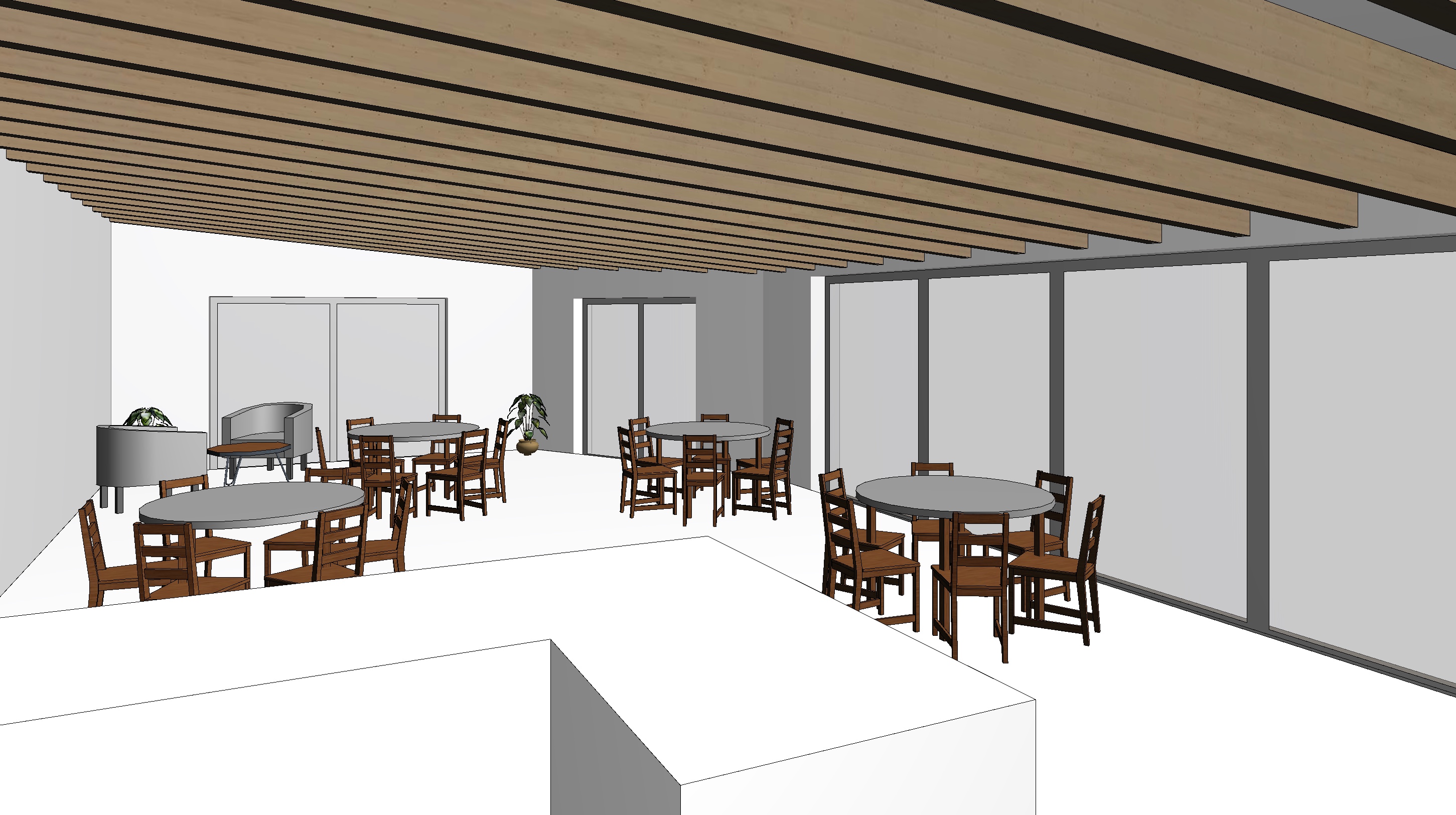 modernist interior shot a cozy and modern caf interior with a warm and inviting atmosphere the wooden tables and chairs have a natural oak finish providing a rustic charm the ceiling beams are dark walnut contrasting beautifully with the soft off white and grayish petrol colored walls the large windows let in gentle diffused natural light creating a serene ambiance the bar stools have a sleek industrial design in matte black add soft ambient lighting with small pendant lights above the tables casting a warm golden glow enhancing the cozy and relaxed environment architecture
