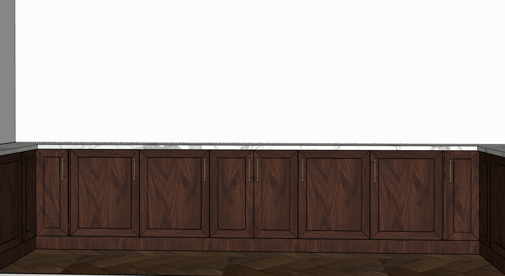 this is a beautiful walk in closet for a master bedroom the cabinets are made of a natural stained knotty walnut the cabinets are all 12in deep with flush base trim along the bottom the floors are a beautiful hardwood and the countertops are white marble there are clothes hanger rods above the countertops