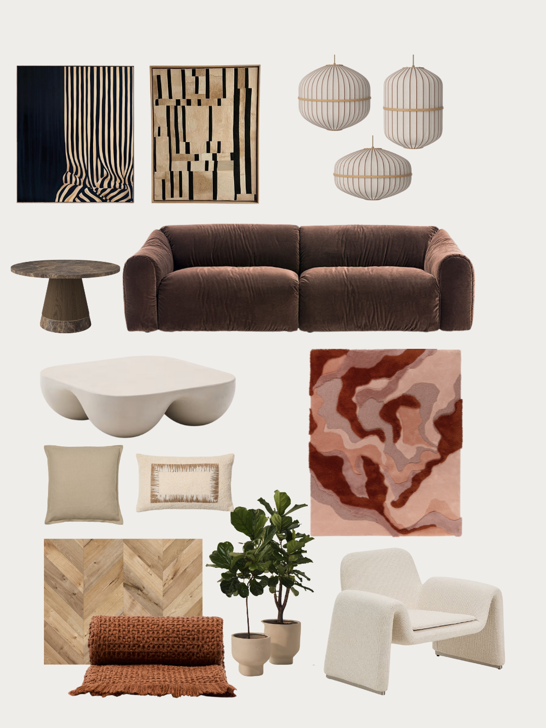 create a realistic modern living room interior inspired by the moodboard with a warm tactile and refined atmosphere the space has 3 meter high ceilings off white walls with simple baseboards and a large panoramic window on the left side filling the room with soft natural daylight the view is from a corner perspective showing the full composition and balance of materials at the center place a dark brown velvet sofa with a low plush silhouette as the focal point the flat matte cement coffee table with smooth organic curves is placed parallel to the sofa creating a calm and grounded central axis to the right of the sofa position a small round dark marble side table for contrast and visual weight beside the window add a white boucle armchair with soft rounded lines casually drape a chunky terracotta knit throw over the chair for warmth and texture lay a large 3 x 3 meter abstract rug in blush rust and rose tones beneath the entire seating area extending under both the sofa and the armchair for cohesion on the coffee table arrange a stack of terracotta colored books as a decorative accent by the window include two fiddle leaf fig plants up to 2 meters tall in matte cream ceramic pots bringing organic height and balance frame the panoramic window with floor length beige linen curtains adding softness and layering above the seating area hang three pendant lights with white linen shades and thin wooden ribs in varying diameters from 60 to 90 cm suspended at slightly different heights for rhythm and harmony behind the sofa mount two geometric acrylic wall art pieces in beige and black tones adding structure and depth style the sofa with light beige pillows one with embroidered detailing for subtle texture the flooring is natural oak in a herringbone pattern grounding the warm palette with an organic foundation the overall mood is modern minimalistic yet multilayered combining deep earthy tones sculptural shapes and tactile materials to create a space that feels inviting elegant and effortlessly balanced