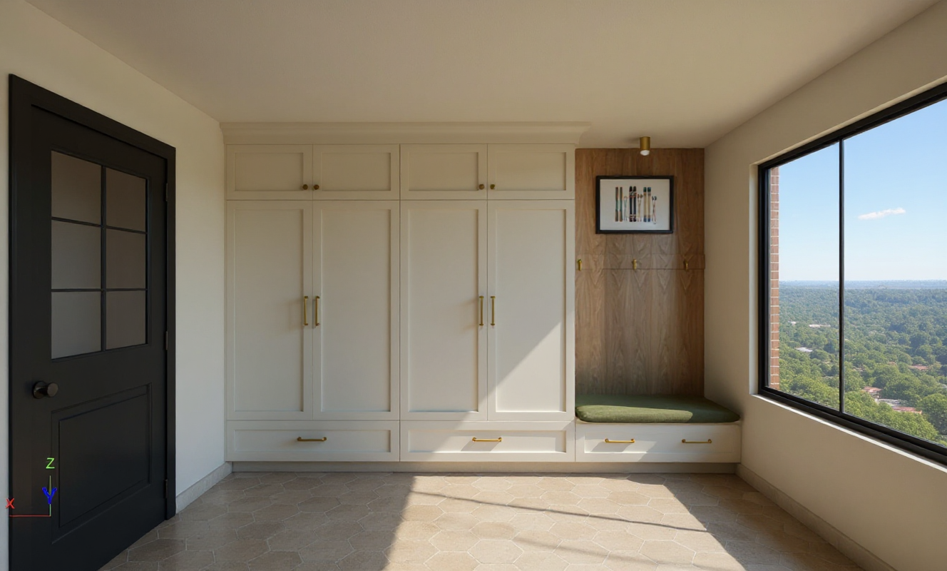 this is a foyer change the floors to herringbone white oak change the door and windows to black with white wood trim change the window above the door to black with white wood trim update the chandelier make the tray ceiling bigger and add detail add a white wood board accent wall on the right wall remove the rug