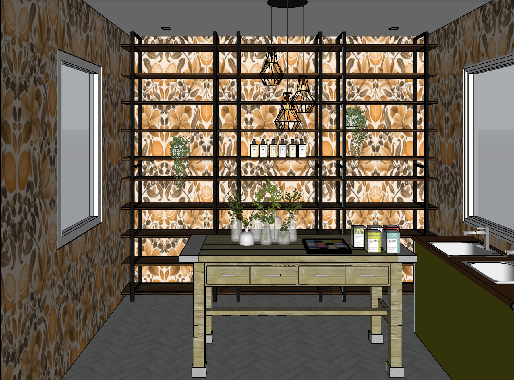 create a photo realistic render of the reference image showing a pop up kiosk in a farmhouse style with floral wallpaper timber shelving displaying upmarket soap and candles and a timber table with a display of scented candles soaps and flowers in glass vases the view outside the windows is of a shopping mall natural light filters through the windows with soft light coming from the lit pendant chandelier led strip lights at the back of the shelving light the display shelves