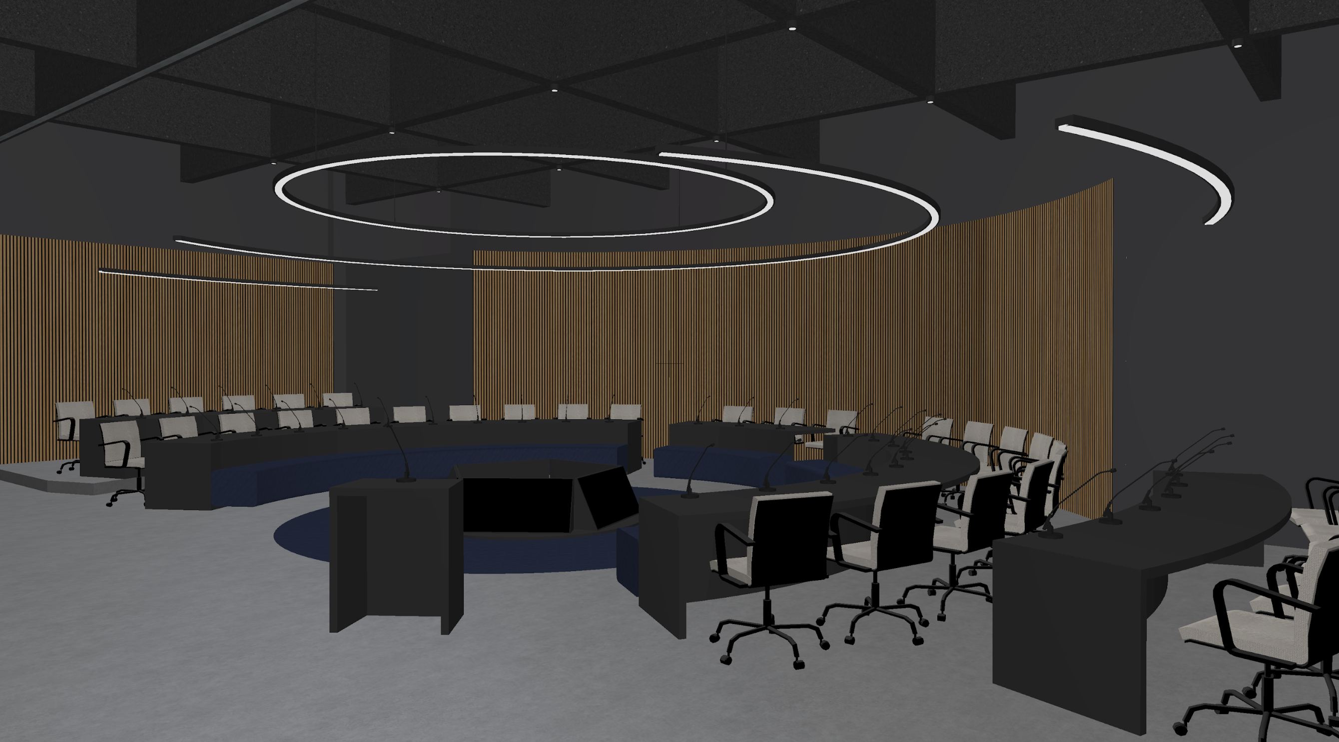 a city council chamber with a brutalist concrete ceiling and walls clad in warm wooden acoustic panels the floor is covered with a light grey carpet featuring a central blue circular motif black minimalist furniture is arranged in a semi circular layout politicians are seated on chairs engaged in conversation creating a dynamic and realistic scene