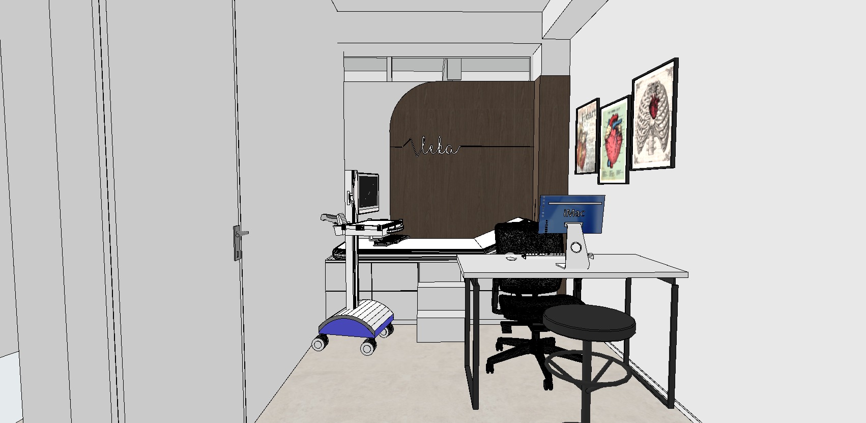 this is the cardiology office room the render should look as realistic and high quality as possible the ambient light should not be warm but brighter the wood texture should look as realistic as possible and behind the wood panel place led lights also the logo on the wood should look as clear as possible it is also done with led lights on the left side is the ultrasound for heartbeats and it should look as realistic as possible on the work table place minimal sparse decorations while on the right side on the floor place led lights so don t change anything just the render should look as realistic and high quality as possible
