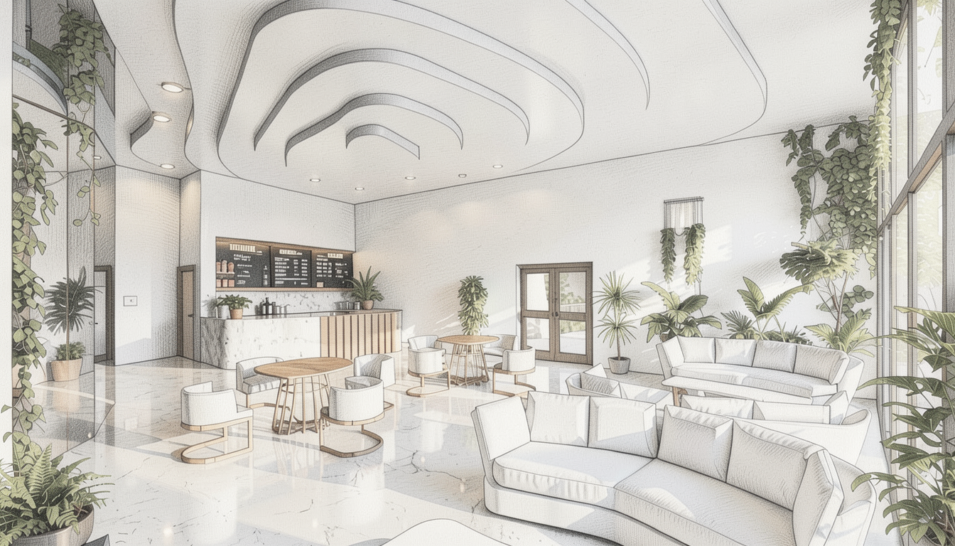 render this image realistically the ceiling dark blue and the back walls dark blue and the dark chairs blue