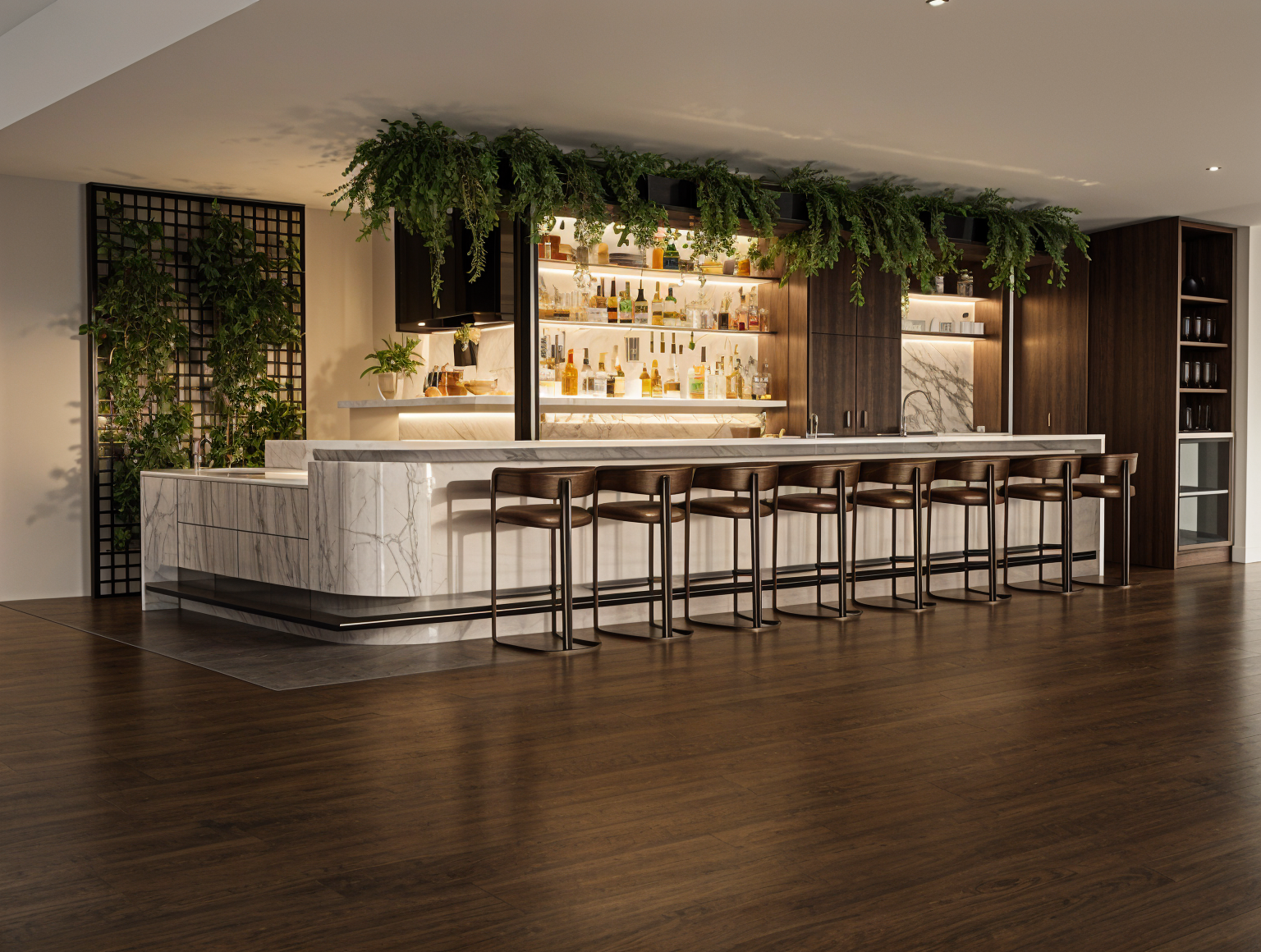 render a sophisticated bar interior with a sleek modern design feature a beige and light wood bar counter with subtle marble accents and black metal bar stools incorporate lush green hanging plants cascading gracefully above the bar use a soft warm lighting to create an inviting and cozy atmosphere the walls should be a neutral taupe with a geometric pattern climbing with ivy add a wooden floor in a rich dark brown hue to enhance the elegant ambiance place a neatly organized shelf with colorful bottles and chic decor elements reflecting a stylish and contemporary setting