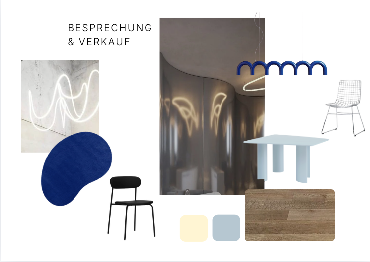 exterior shot please place five chairs around the table three black chairs and two aluminum chairs as shown in the moodboard both pendant lights should be included one should be centered above the table and the second one should act as an accent light in the foreground the flooring should follow the wooden plank material and color shown in the references the color palette should be based on the moodboard including soft neutral tones combined with muted blue accents the back wall should be designed as a curved surface creating a smooth and continuous spatial flow the kitchen area should be finished in an aluminum stainless steel look with a clean and slightly reflective surface at the back right side of the kitchen a curtain in a soft butter yellow tone should be added the adjacent wall should be painted in the same butter yellow color the overall atmosphere should be bright and positive with natural daylight entering from the window sunlight should softly illuminate the space creating a warm and inviting mood