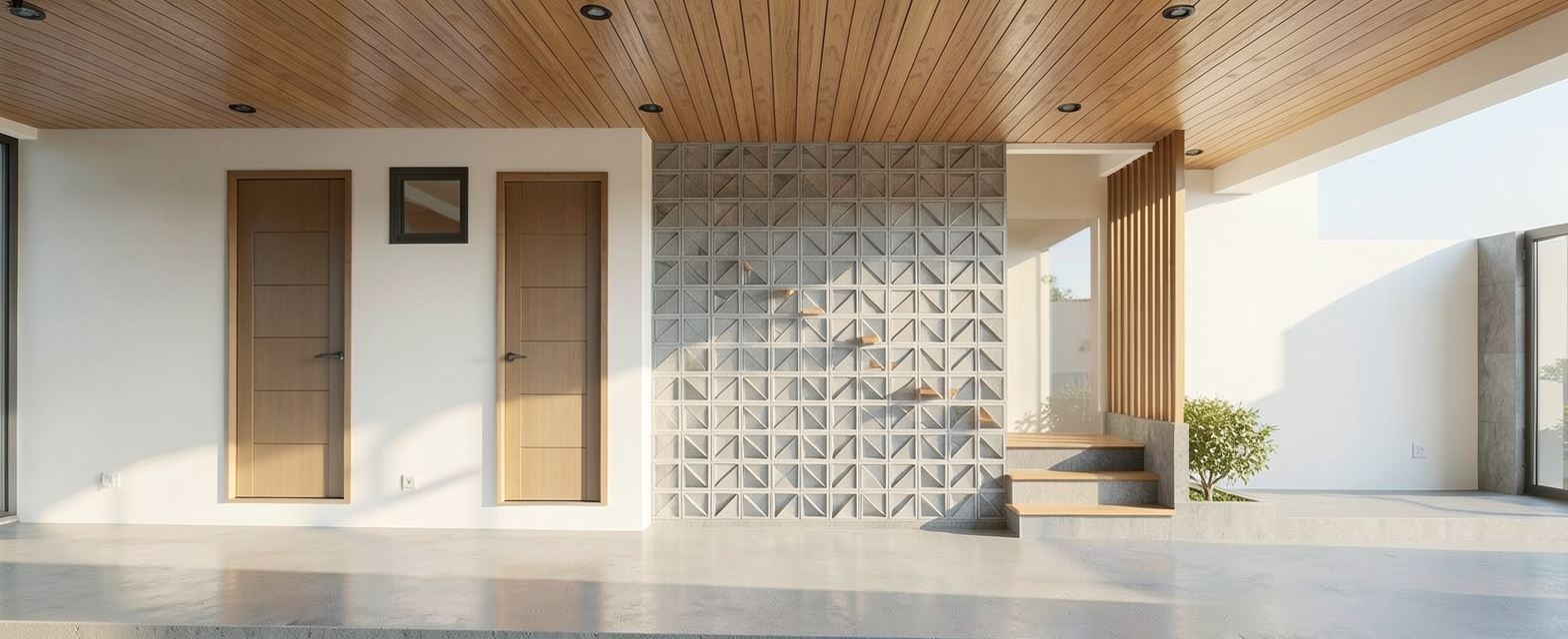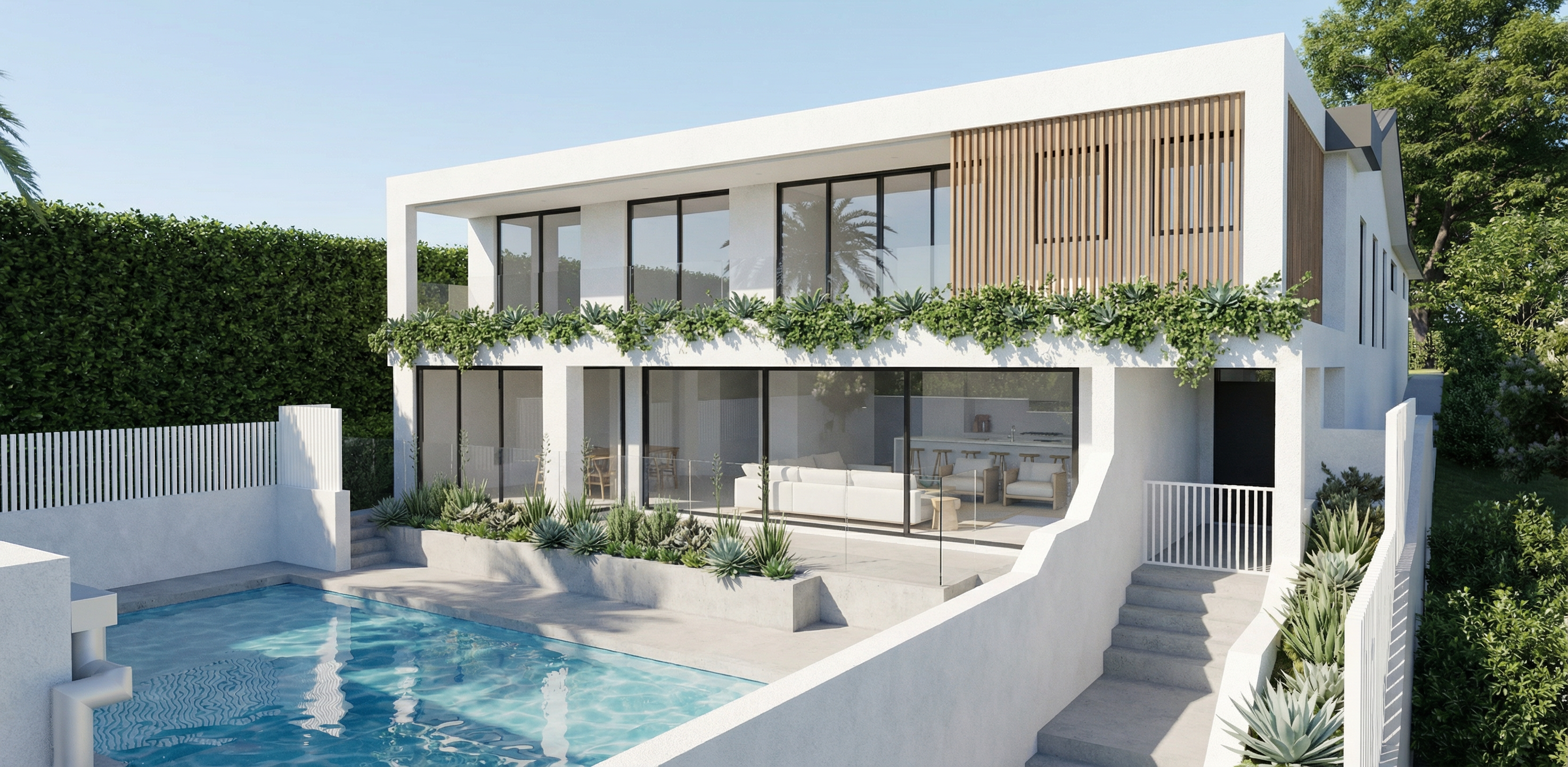 modern farmhouse rustic stone gables vertical wood siding stone tower large glass windows tall grass foreground