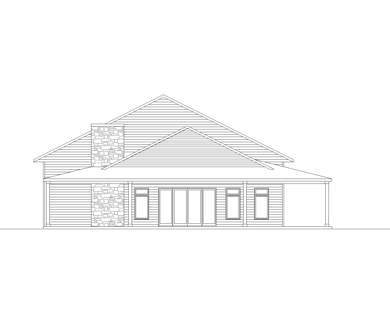 dark green siding black trim and windows wood columns black roof stone fireplace landscaped yard sky background