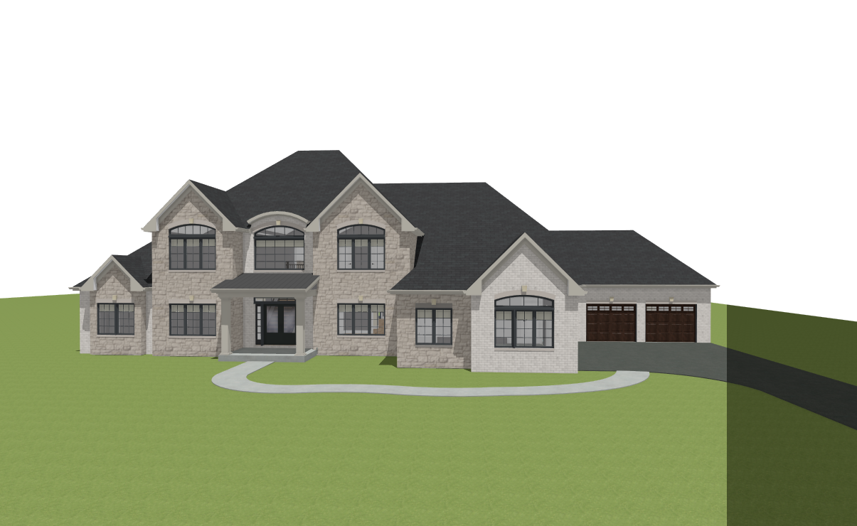 render this 3d image to appear photo realistic maintain all existing architectural materials and structural elements exactly as shown enhance the setting with a well maintained landscape include minimal beds manicured shrubs and a tree lined backyard the windows should have a glossy finish with clear reflections of the surrounding trees and sky lighting should feel natural with soft shadows and realistic depth to bring the scene to life