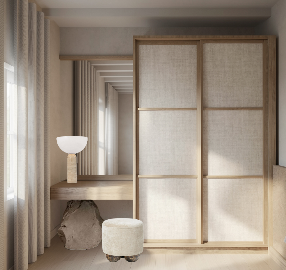 create a highly realistic render of a bedroom with a calm and serene atmosphere the lighting is soft and natural creating a peaceful and balanced mood with minimal shadows ultra realistic render high resolution professional interior design magazine photography style the stool on the left is beige fabric with taupe marble round legs in the colors you see keep exactly the same design and layout of the space the walls has a light beige soft concrete effect
