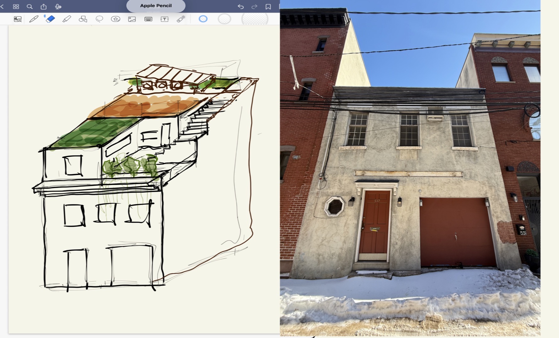 create rendering using photo of existing conditions and sketch showing proposed addition proportions and materials to be driven by photo include neighboring properties for scale