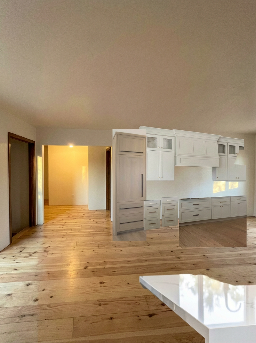 do not change the layout of this kitchen integrate the kitchen cabinetry seamlessly into the existing room match the perspective scale and camera angle of the space adjust lighting color temperature and shadows so the cabinets appear naturally lit by the room s ambient light add realistic floor contact shadows and subtle reflections ensure the cabinetry is anchored to the floor and walls with correct proportions blend edges and materials to remove any cute and paste appearance maintain realistic textures and depth