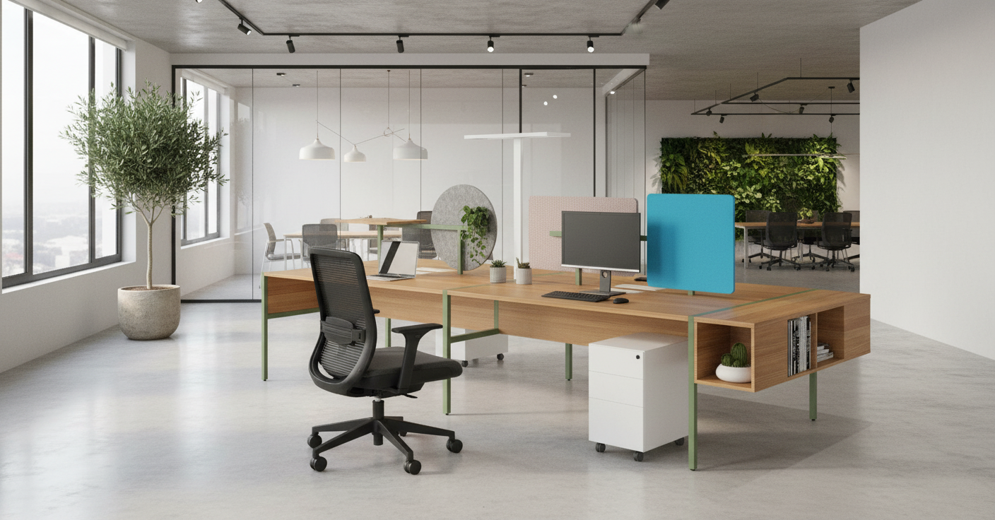 fine art concept campaign photography for premium office chair hero all black high back horizontal mesh office chair floating in surreal infinite color gradient space scene seamless infinity cove studio floor and background melting into one continuous gradient sweep deep forest green at base flowing through teal electric blue to pale violet at top chair sitting on perfect mirror floor section flawless upside down reflection below four person oak desk arrangement visible in soft focus mid ground right grounding in real workspace context chair macro details highlighted horizontal mesh rib micro texture hyper sharp each individual rib strand rendered perfectly lumbar cutout revealing gradient color through mesh opening t armrest casting geometric color shadow on seat gradient colors of environment reflecting faintly on matte black surfaces surrounding abstract colored geometric forms floating sage green rectangular volume left amber wood tone floating plane right referencing desk and acoustic screen shapes abstractly lighting gradient color studio lighting system green base light from below blue key from upper left violet fill from right white rim defining chair silhouette color palette forest green teal electric blue violet gradient against all black chair style herman miller campaign meets fine art installation product as sculpture 8k ultra hd centered heroic composition premium restraint ar 16 9 style raw stylize 260 q 2