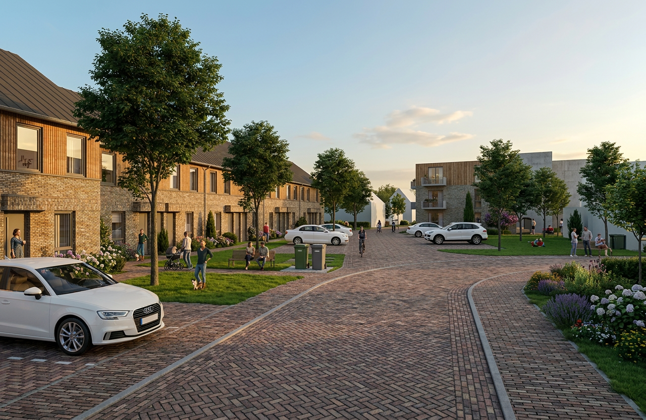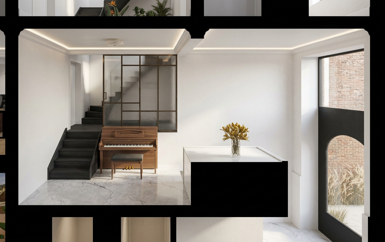 this is a vanity area designed in earthy tones with elegant asthetic mirror includes concealed backlighting creating a soft indirect glow that enhances the atmosphere and adds depth to the composition keep the initial design the chair has boucle of white beige fabric with black metal legs the curtains are white linen fabric on the right
