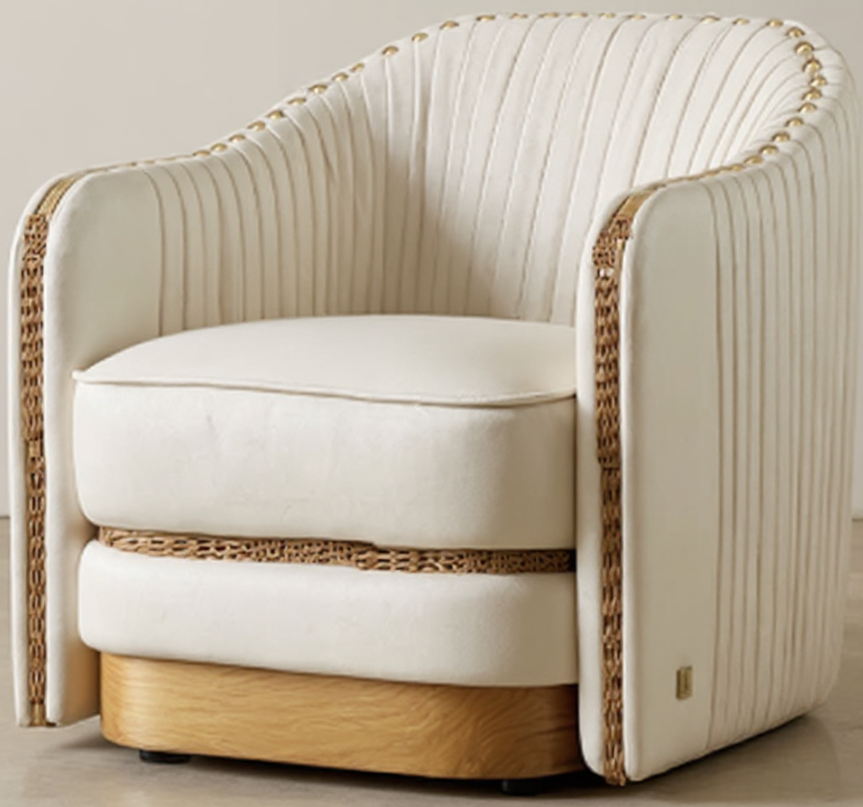 accent raffia weaving arm portion wood base finish upholstered white seat and back