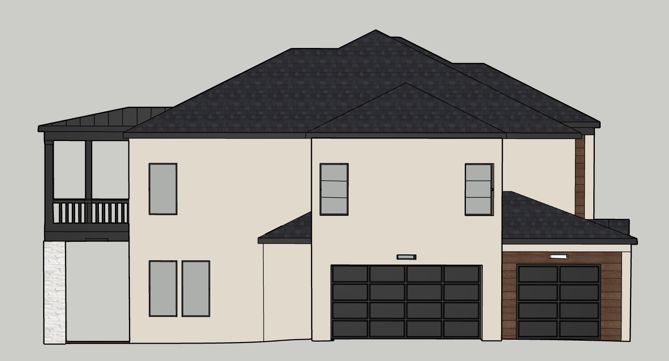 do not move any windows doors or rooflines do not change any colors materials or finishes make the upper right roof the same shingles as the rest of the upper roof and leave everything else exactly the way it is now except render this elevation to look like a photorealistic outdoor scene
