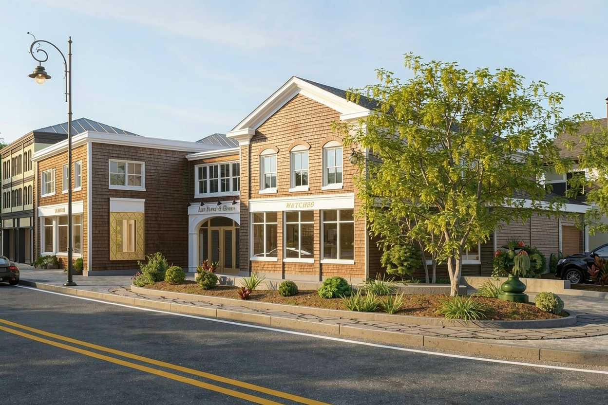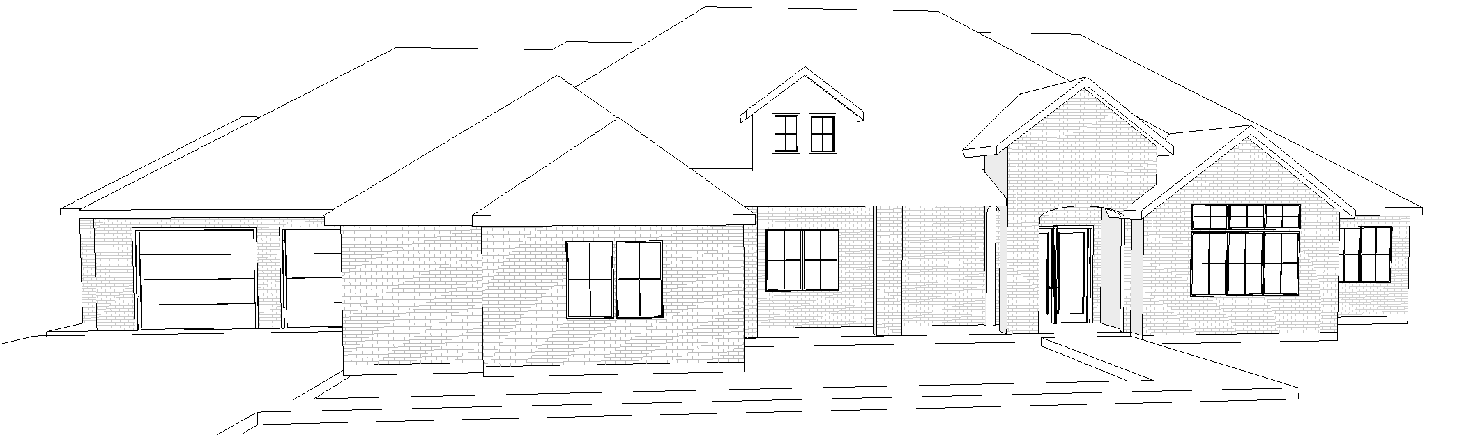 creamy white chopped stone bronze windows dark brown tile roof overcast day lush landscape coach light lanterens on entry