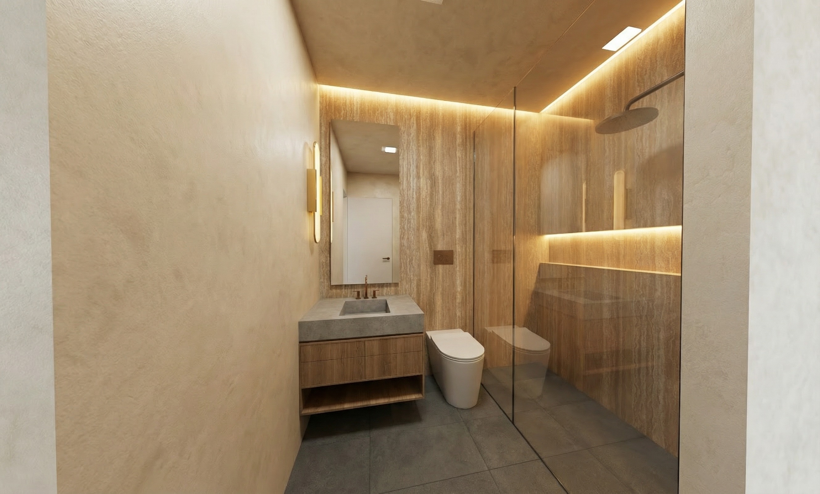make none stone walls white do not change floor pattern and make the tile floor warmer make the sink stone similar to the stone wall