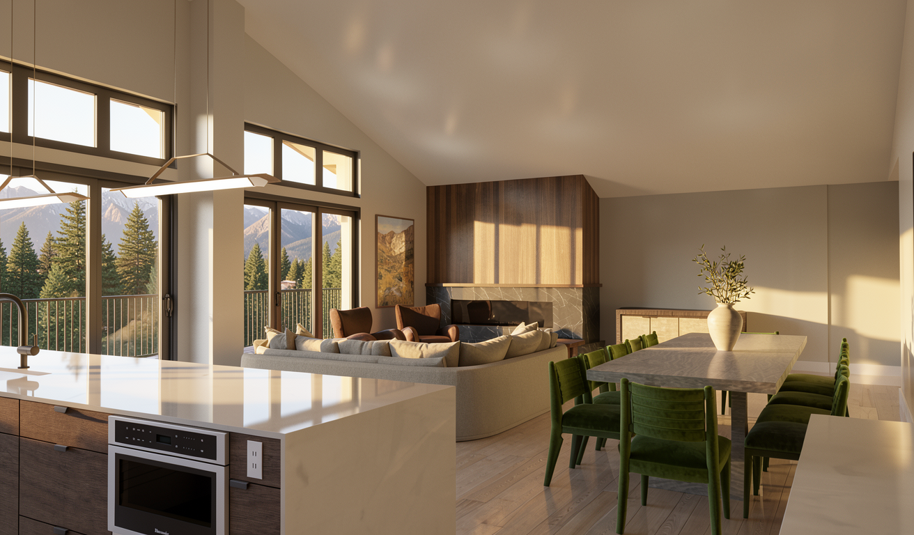 use the uploaded rendering as the exact base image and preserve all architectural elements finishes and furnishings without alteration maintain the same layout proportions materials and design intent do not modify walls ceiling details flooring millwork or furniture placement enhance the image into a highly photo realistic scene with accurate materials refined textures and natural depth improve realism through physically accurate lighting soft shadows reflections and material definition wood grain fabric stone and metal finishes set the lighting to golden hour with warm directional sunlight entering the space create a soft glow with long shadows and a warm inviting ambiance while maintaining balanced interior exposure through the sliding doors replace the exterior with a realistic view of breckenridge colorado featuring alpine mountain scenery with evergreen trees and natural terrain ensure the landscape feels geographically accurate and seamlessly integrated with the lighting conditions add an exterior deck directly outside the sliding doors with clean modern black railings the deck should feel cohesive with the architecture and properly scaled to the space ensure reflections light spill and perspective between interior and exterior are consistent and believable final output should appear as a professional architectural photograph not a rendering highlights and balanced interior exposure the final image should feel like a real high end residential photograph with no distortion or redesign of the original space make the two accent chairs by the fireplace olive grey velvet